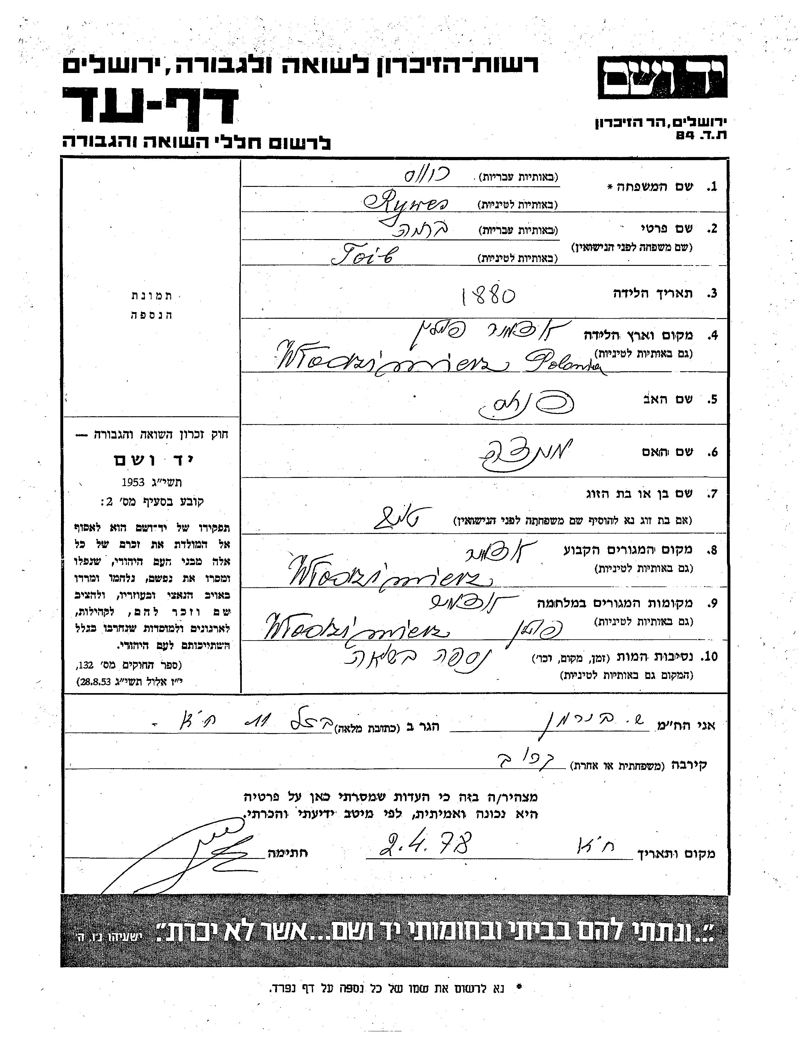 Rywes Batia 1880 Ludmir, Pologne Feuille de témoignage