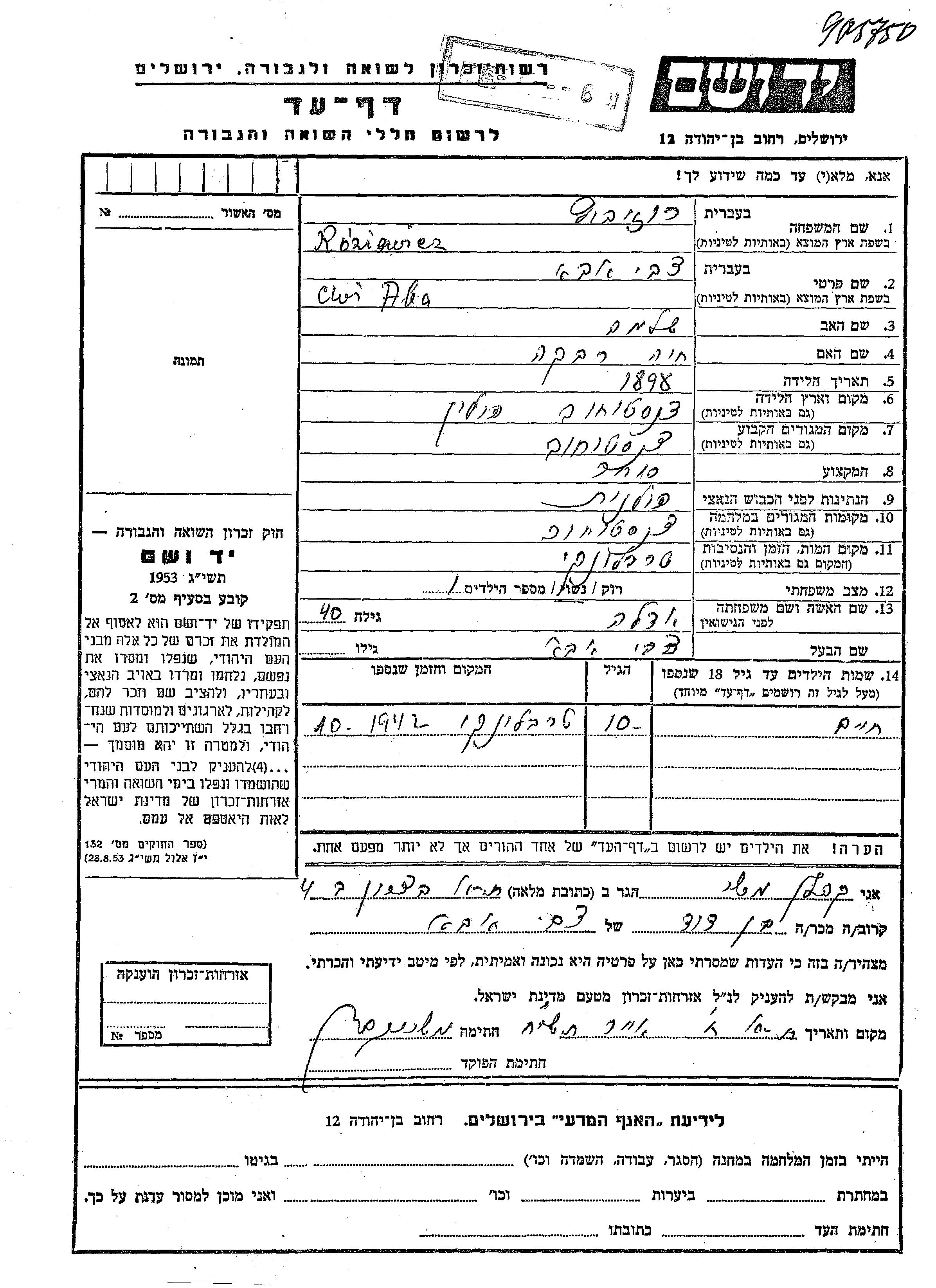 Roziewicz Cwi Aba 1898 Czestochow, Pologne Feuille de témoignage