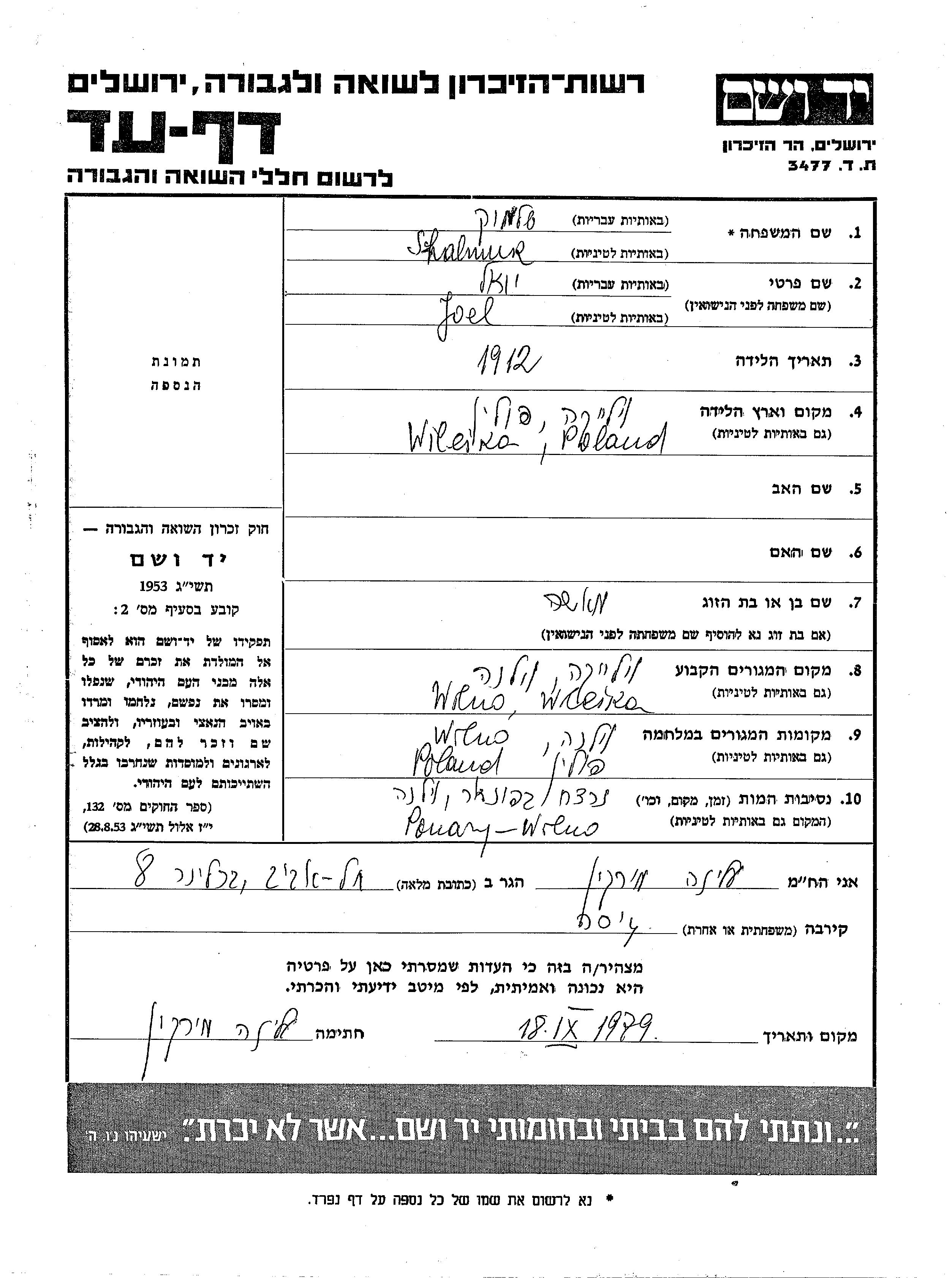 Shalmuk Joel 1912 Wileiko, Pologne Feuille de témoignage