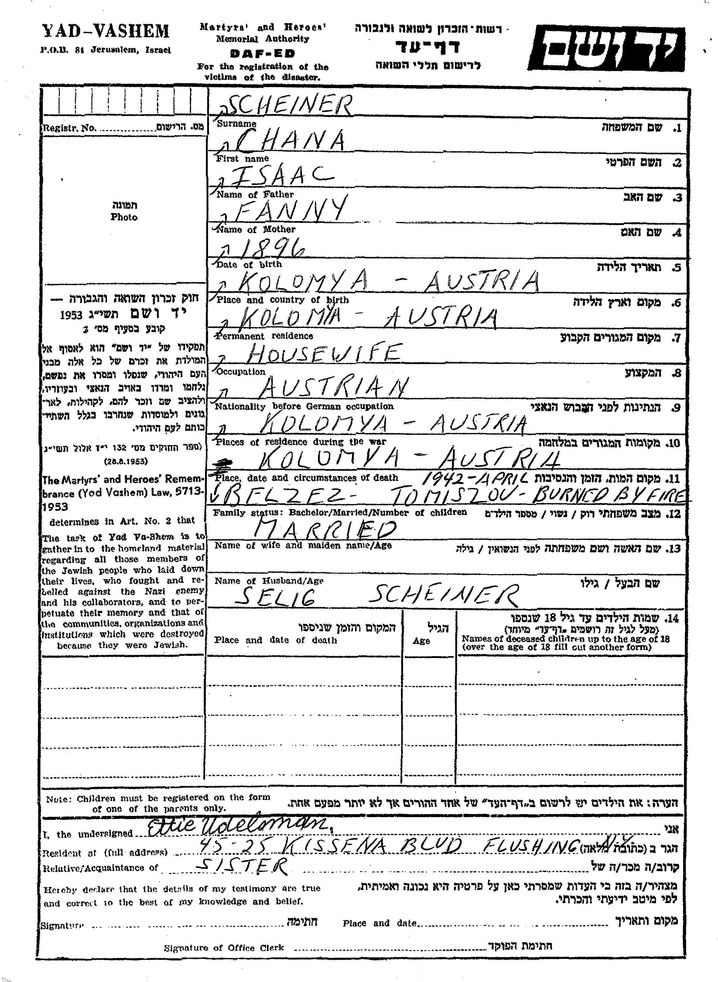 Sheiner Chana 1896 Kolomyja, Pologne Feuille de témoignage