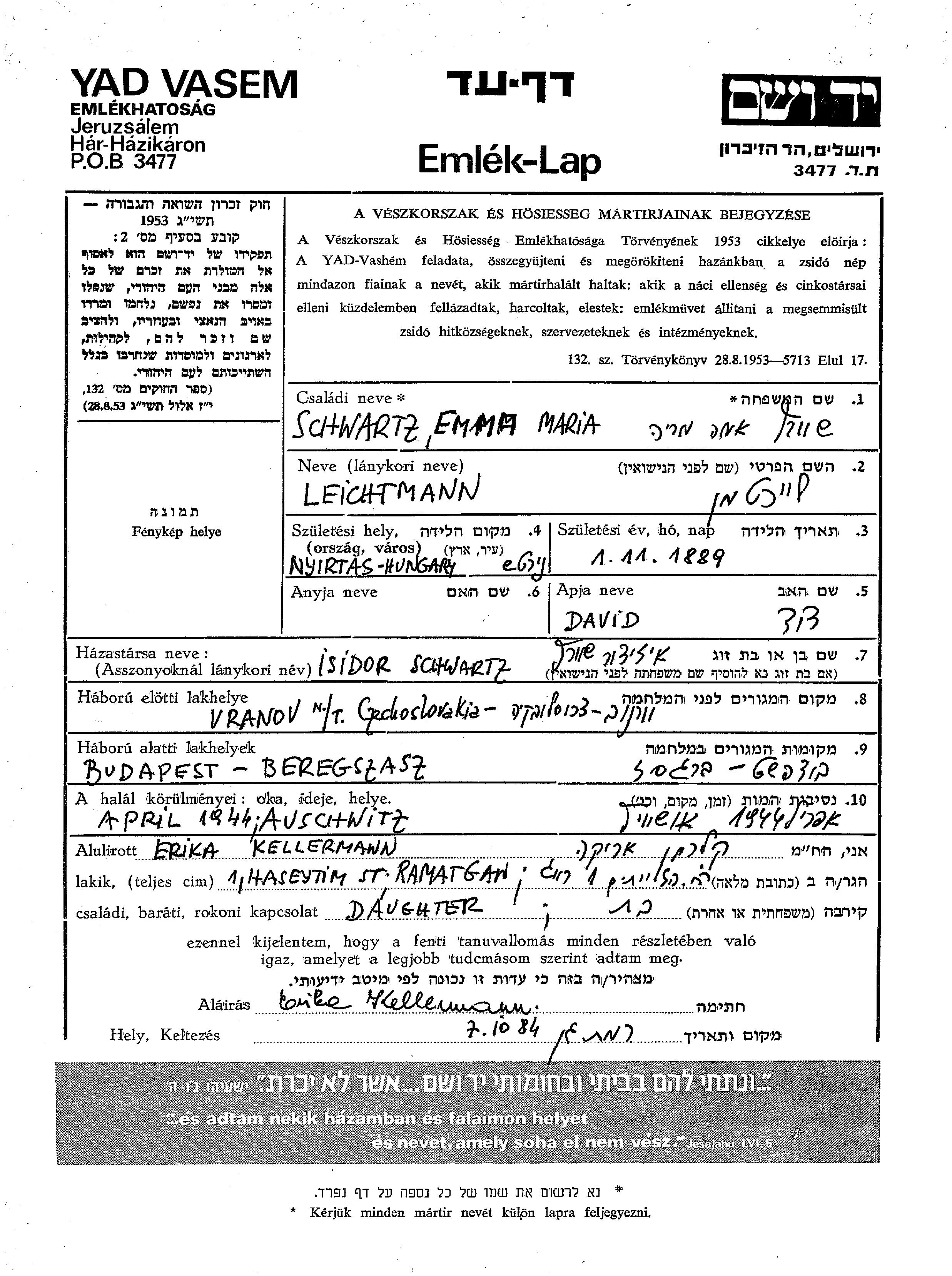 Emma Maria Schwartz née Leichtmann est née à Nyirtass, Hongrie en 1889, fille de David. Elle était Mariée à Isidor. Avant la seconde guerre mondiale elle vivait à Vranov, Tchécoslovaquie. Pendant la guerre, elle était à Beregszasz, Tchécoslovaquie.