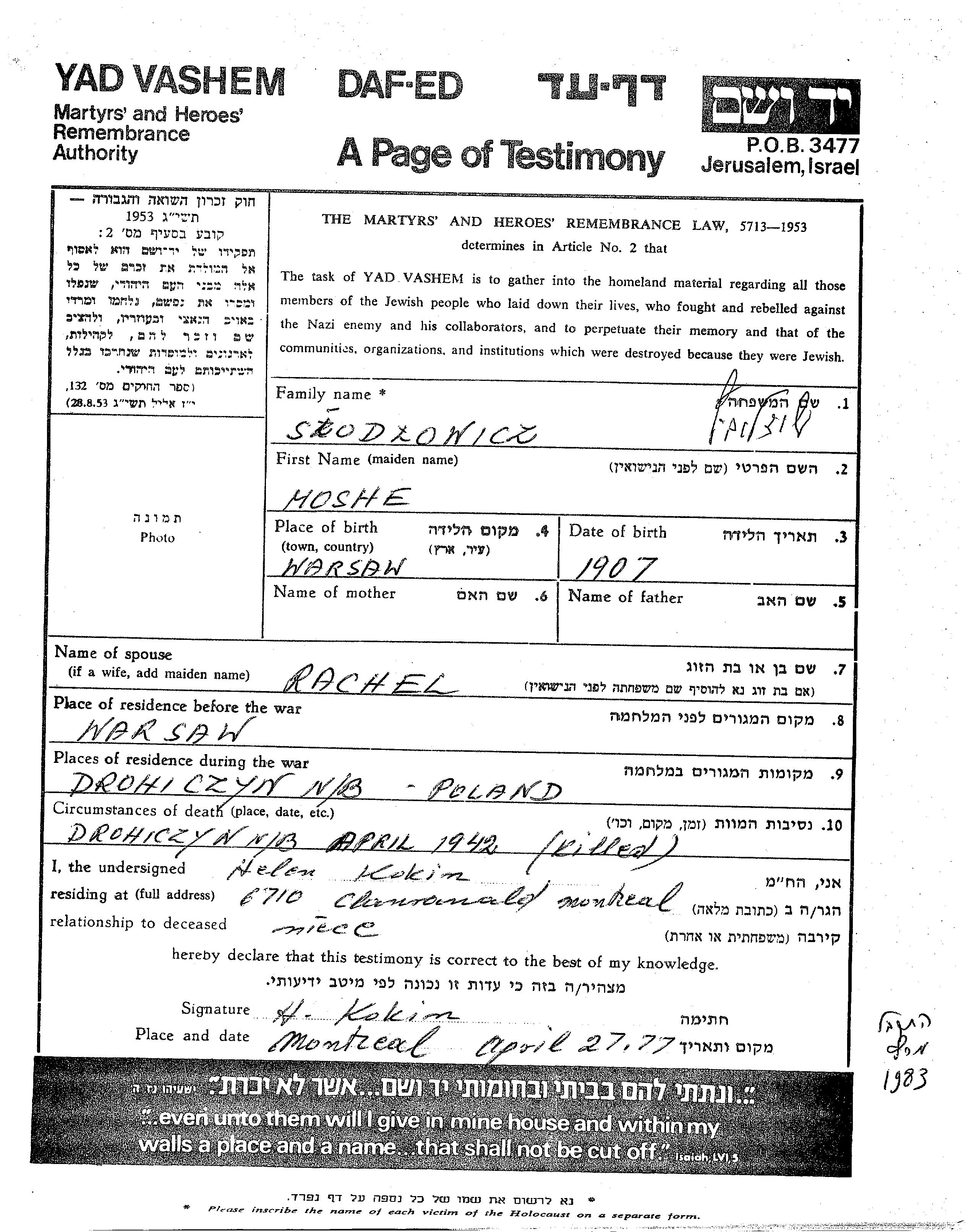 Szodlowicz Moshe 1907 Warszawa, Pologne Feuille de témoignage