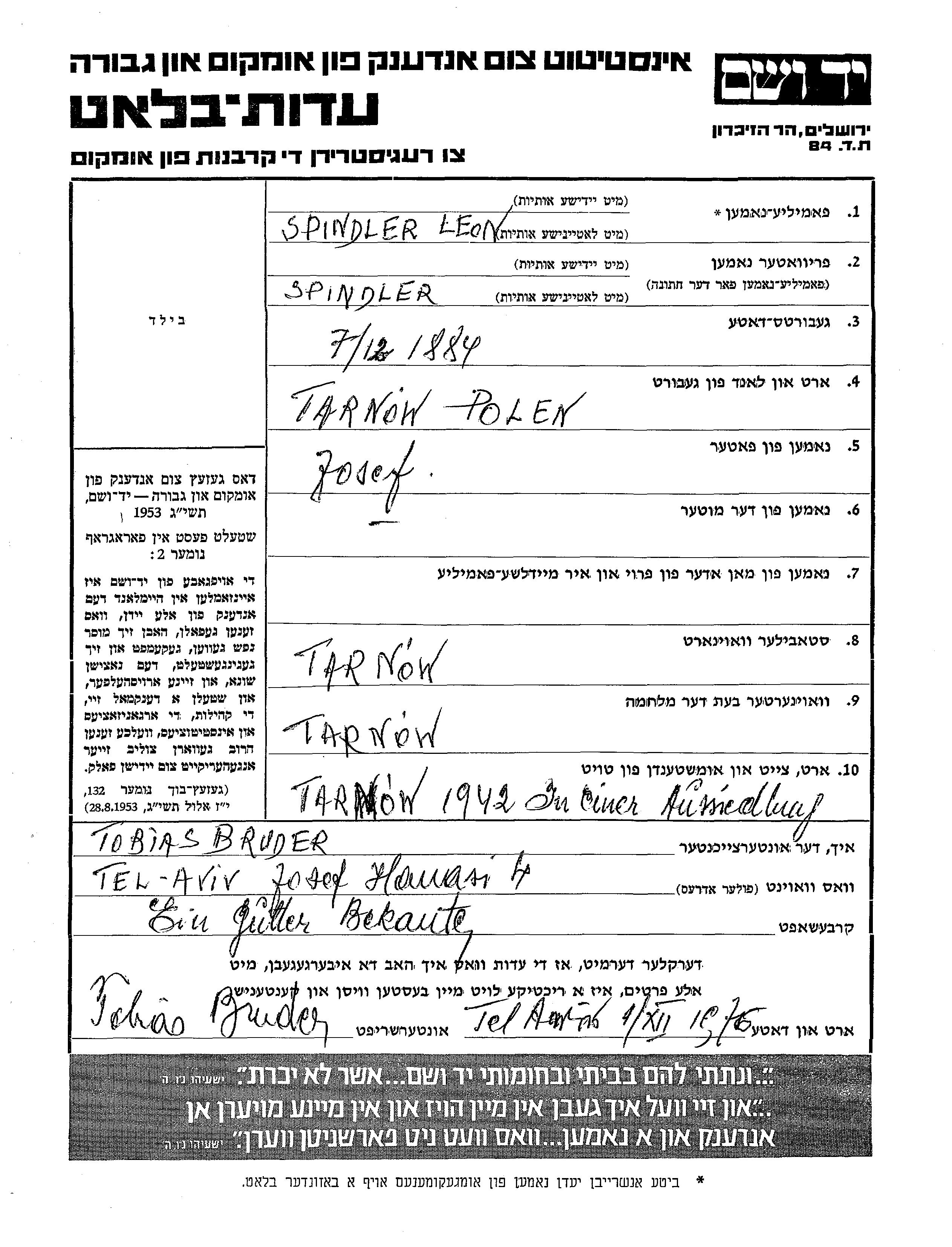 Spindler Leon 1884 Tarnow, Pologne Feuille de témoignage