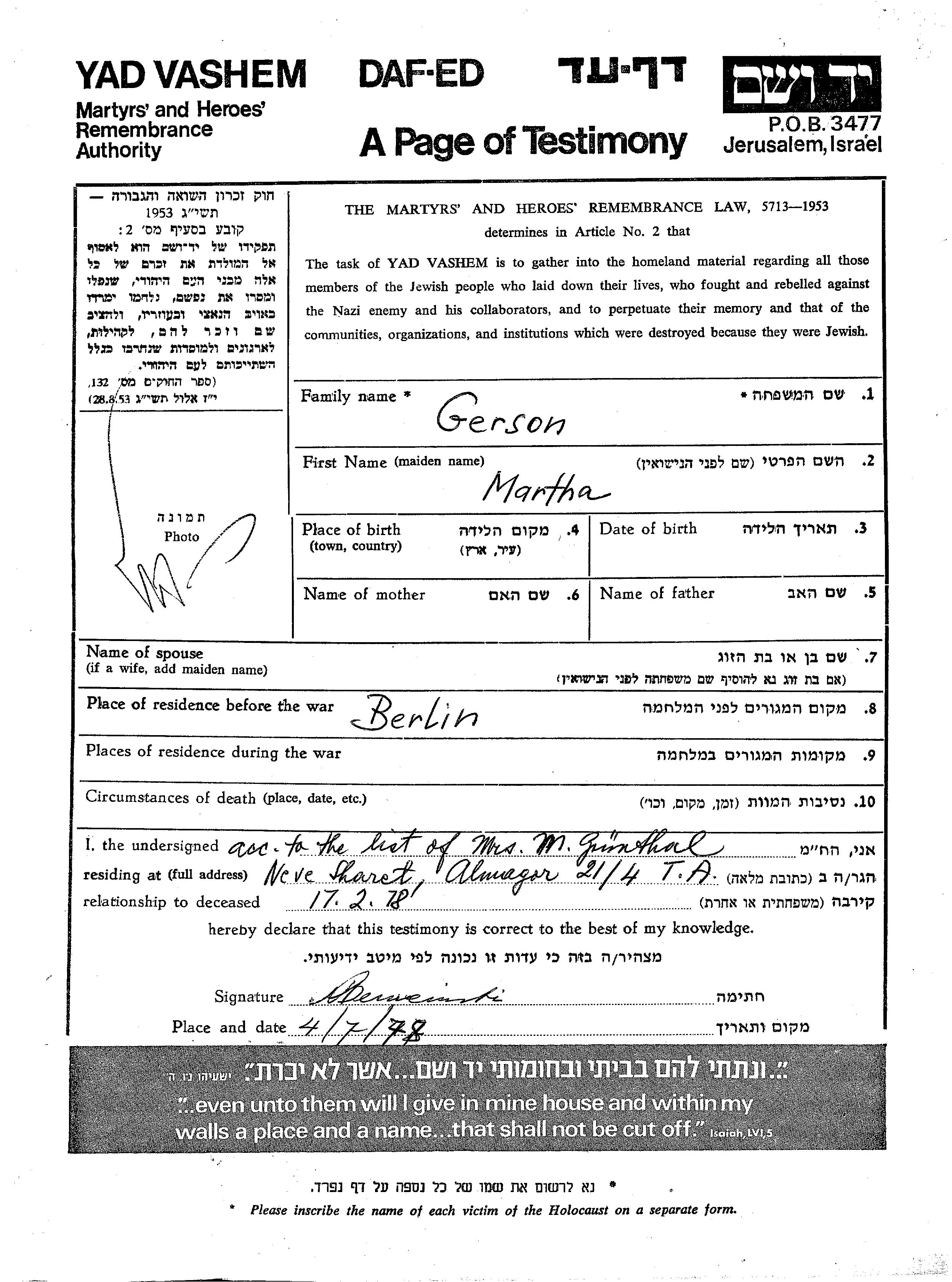 Gerson Marta Berlin, Allemagne Feuille de témoignage