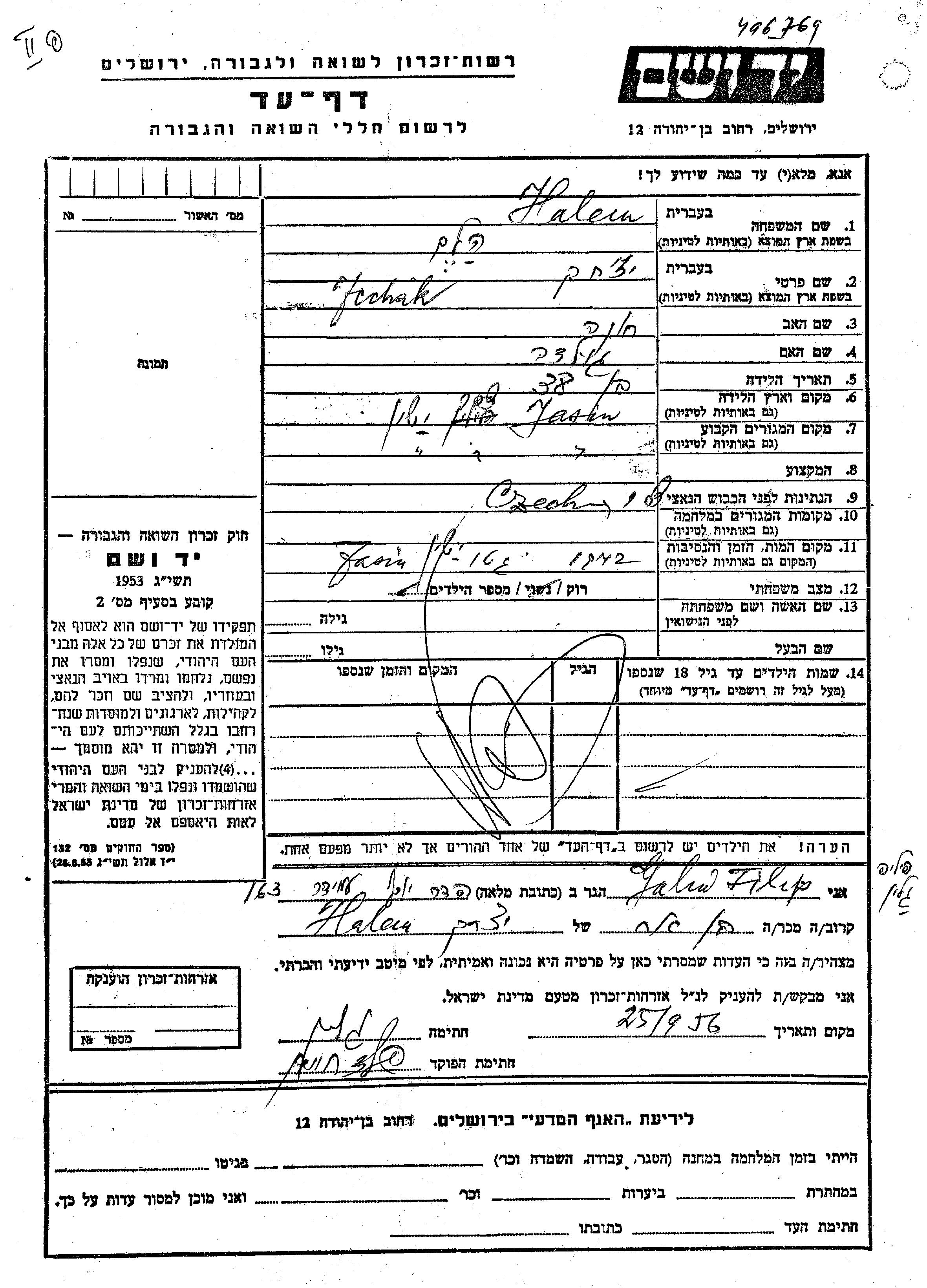 Halem Jcchak Jasin, Tchécoslovaquie Feuille de témoignage