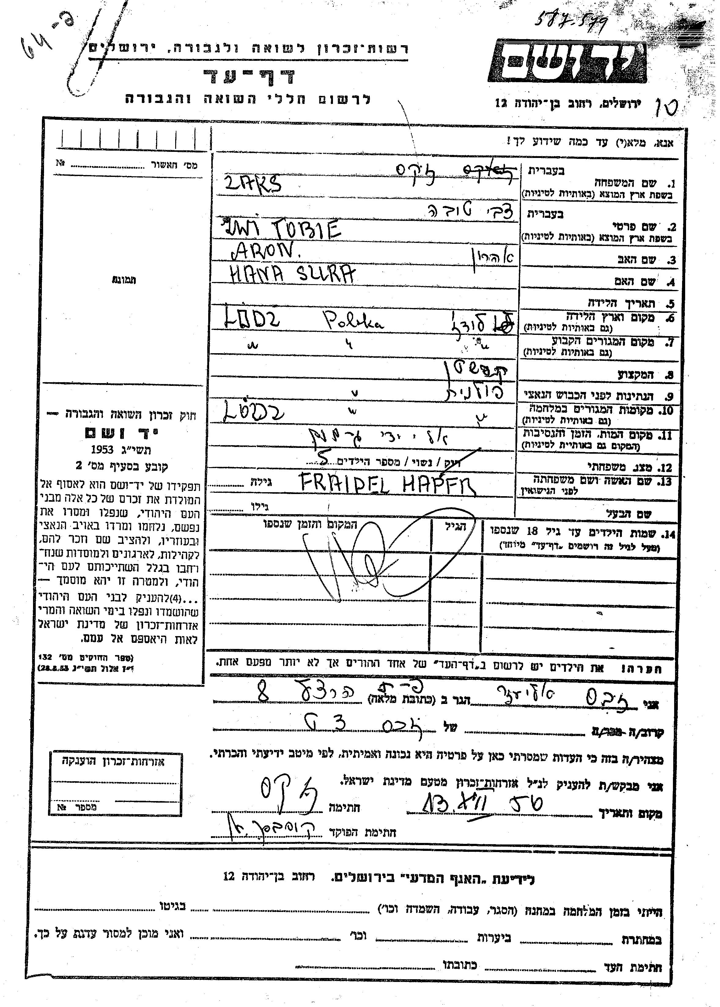 Zwi Tobie Tova Zaks est né à Lodz, Pologne, fils de Aron et de Hana Sura. Il était Bijoutier et Mariée à Fraidel née Haper. Avant la seconde guerre mondiale il vivait à Lodz, Pologne. Au cours de la guerre, il était à Lodz, Pologne.