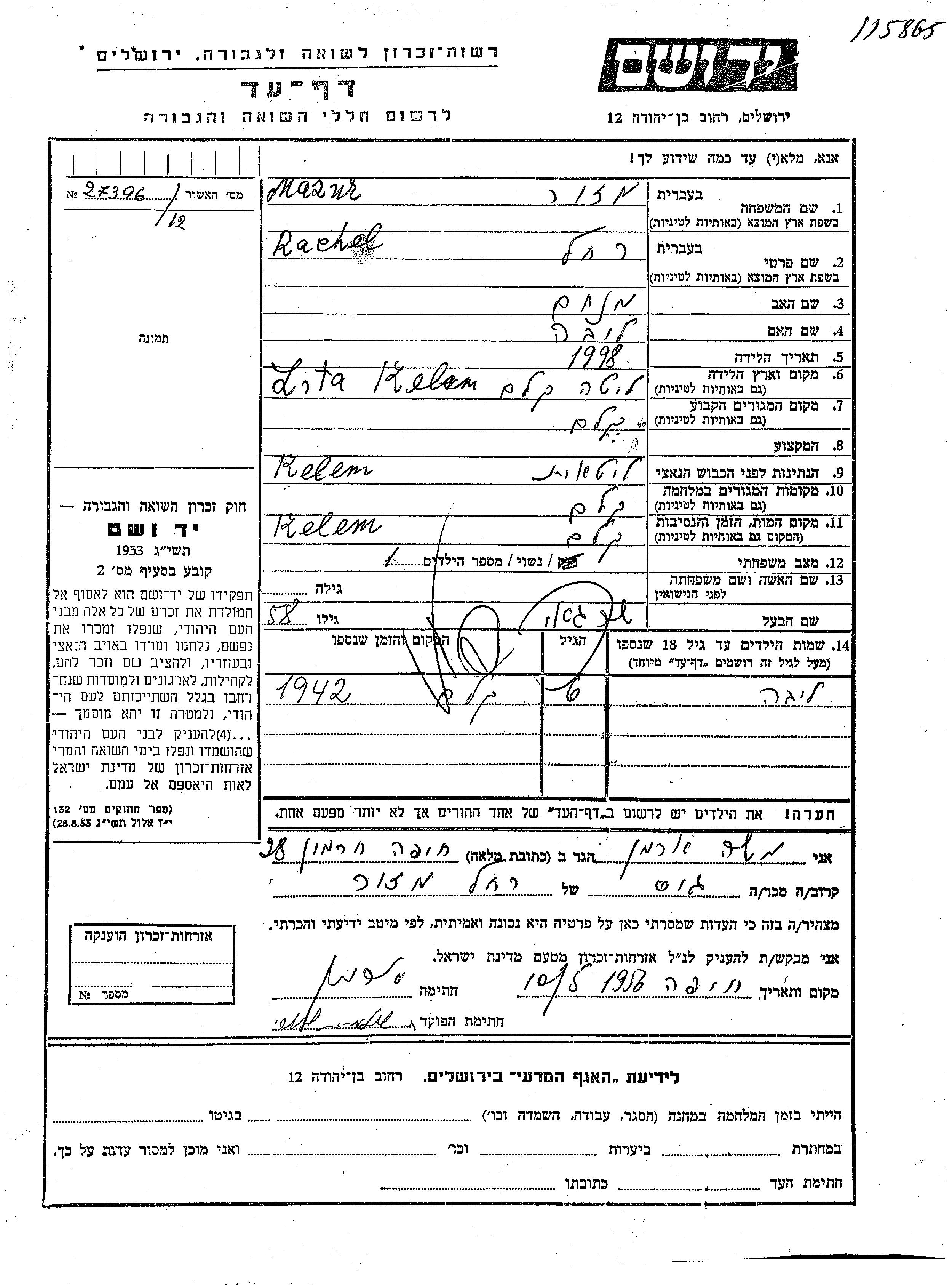 Mazur Rachel 1898 Kelem, Lituanie Feuille de témoignage