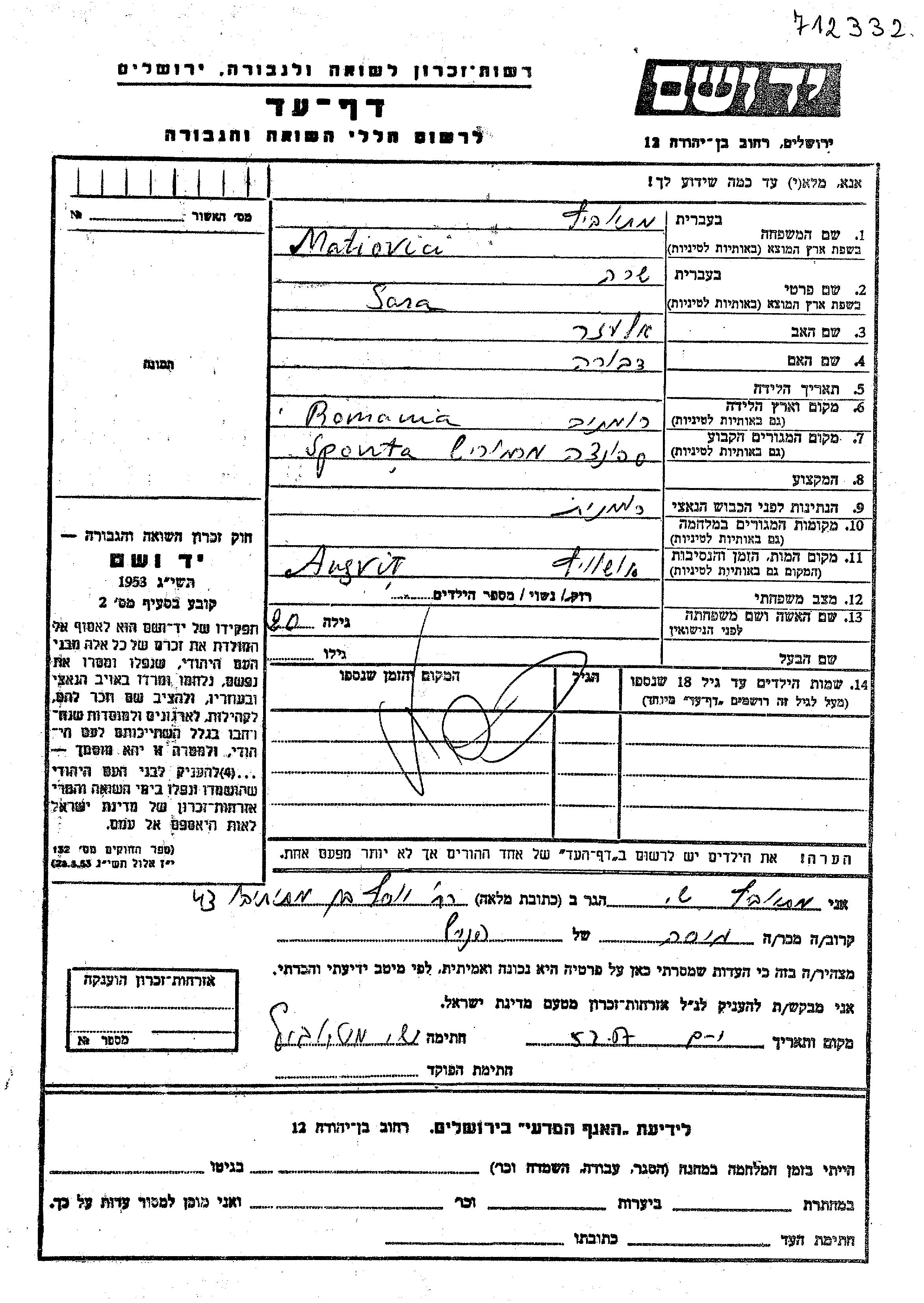 Matiovicz Sara Sponta, Roumanie Feuille de témoignage