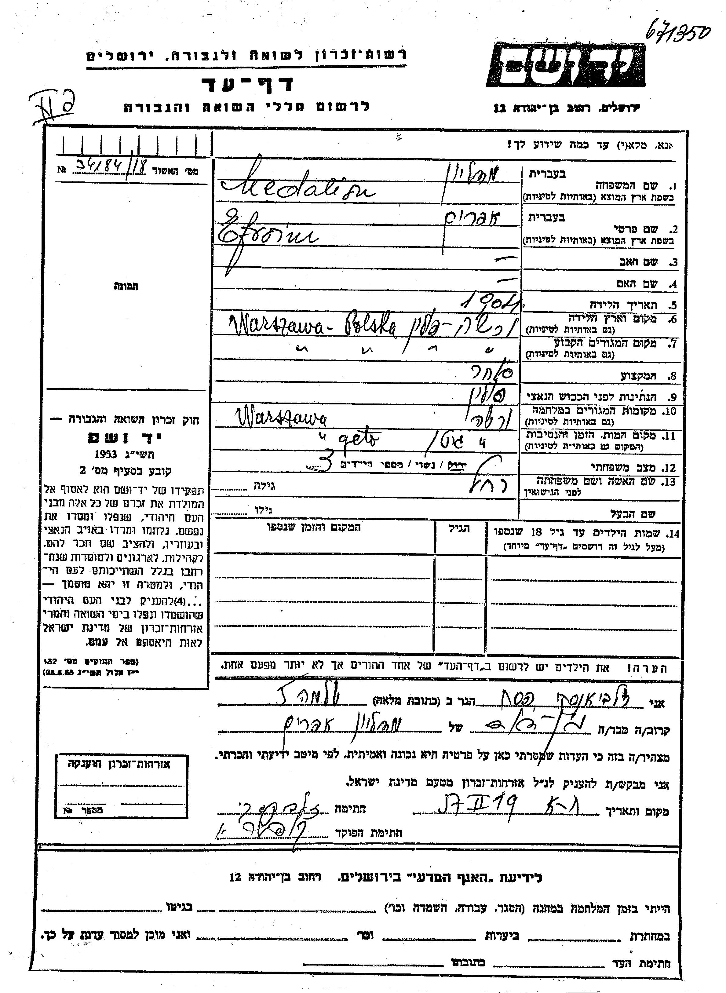 Efraim Medalion est né à Warszawa, Pologne en 1904. Il était Commerçant/e et Mariée à Rakhel. Avant la seconde guerre mondiale il vivait à Warszawa, Pologne. Au cours de la guerre, il était à Warszawa, Pologne.