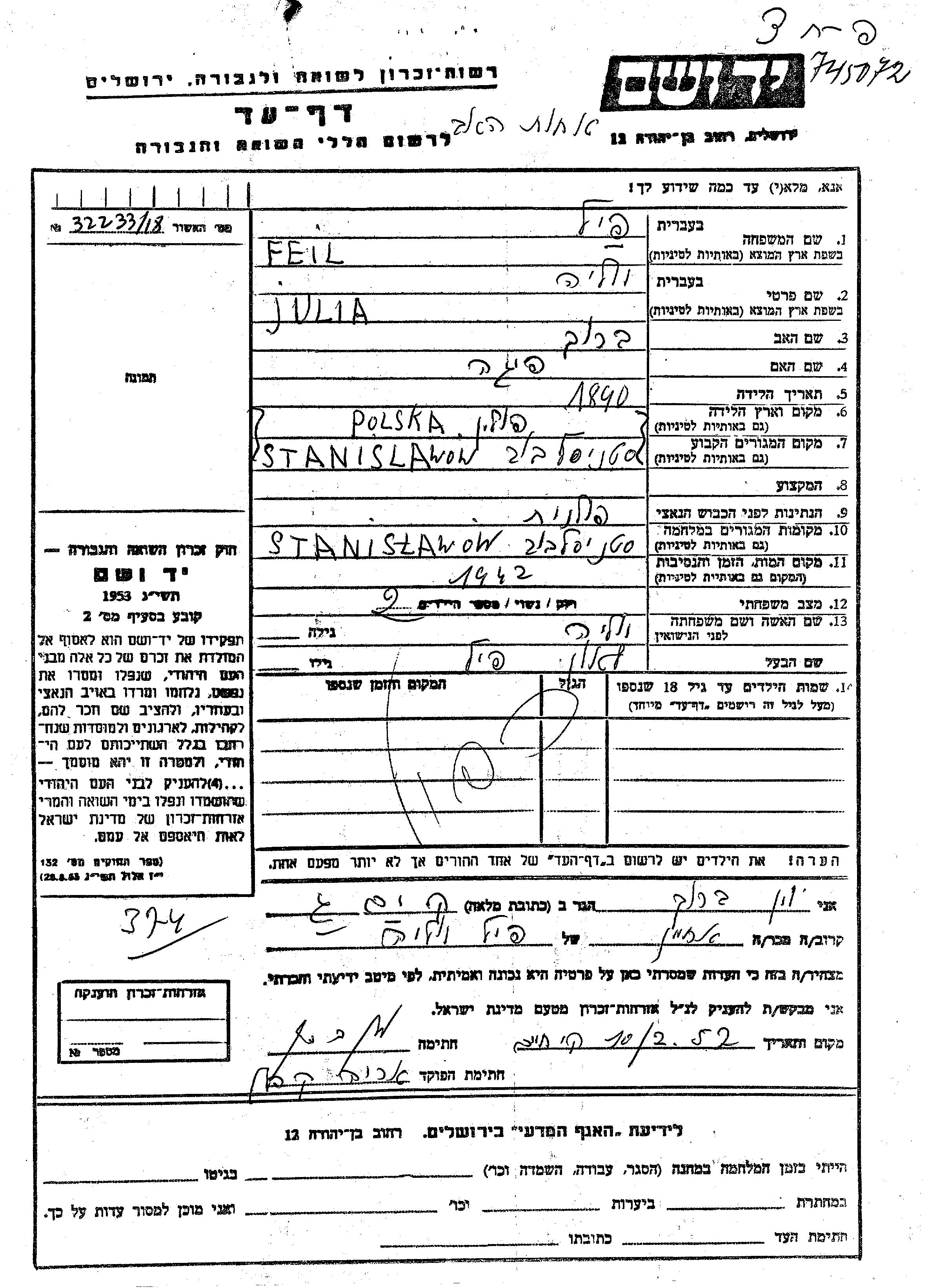 Yad Vashem - Pages of Testimony Names Memorial Collection
