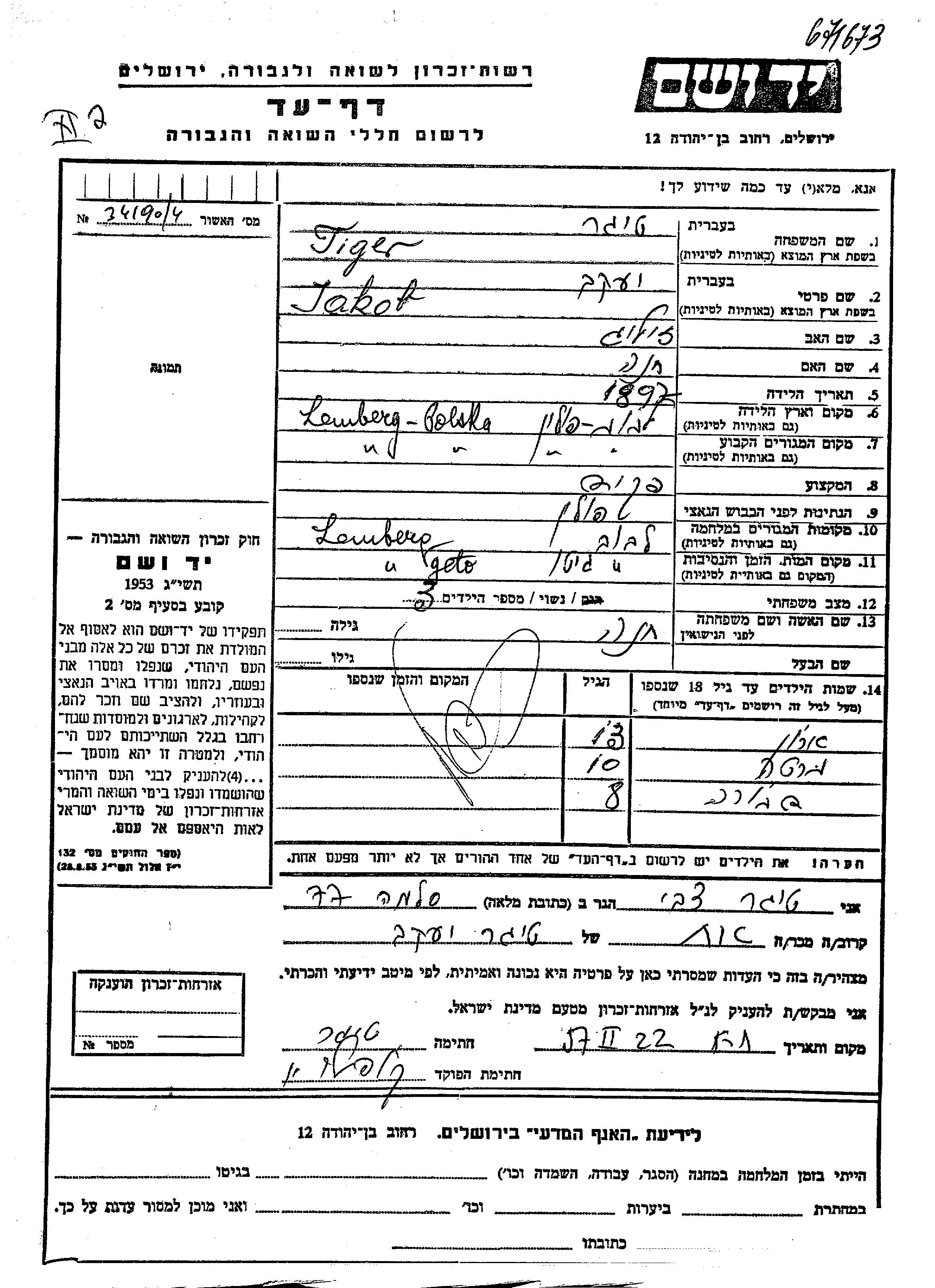 Tiger Jakob 1897 Lemberg, Pologne Feuille de témoignage