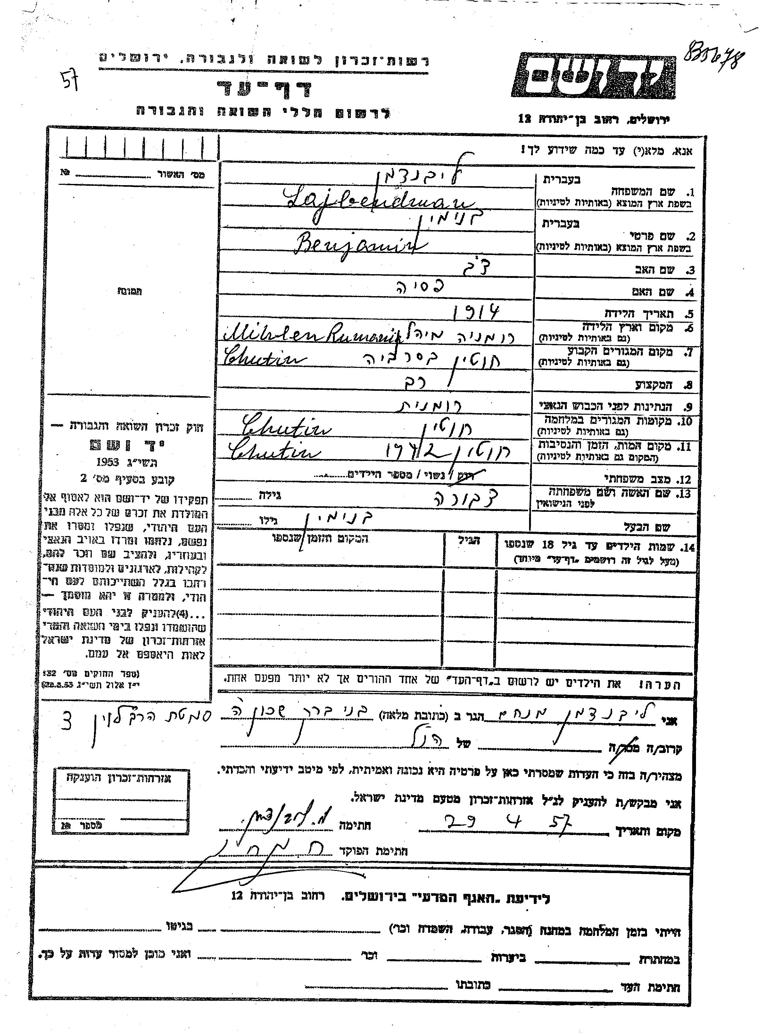 Beniamin a été assassiné pendant la Shoah. Lieu de la mort: Hotin, Roumanie en 1942.
