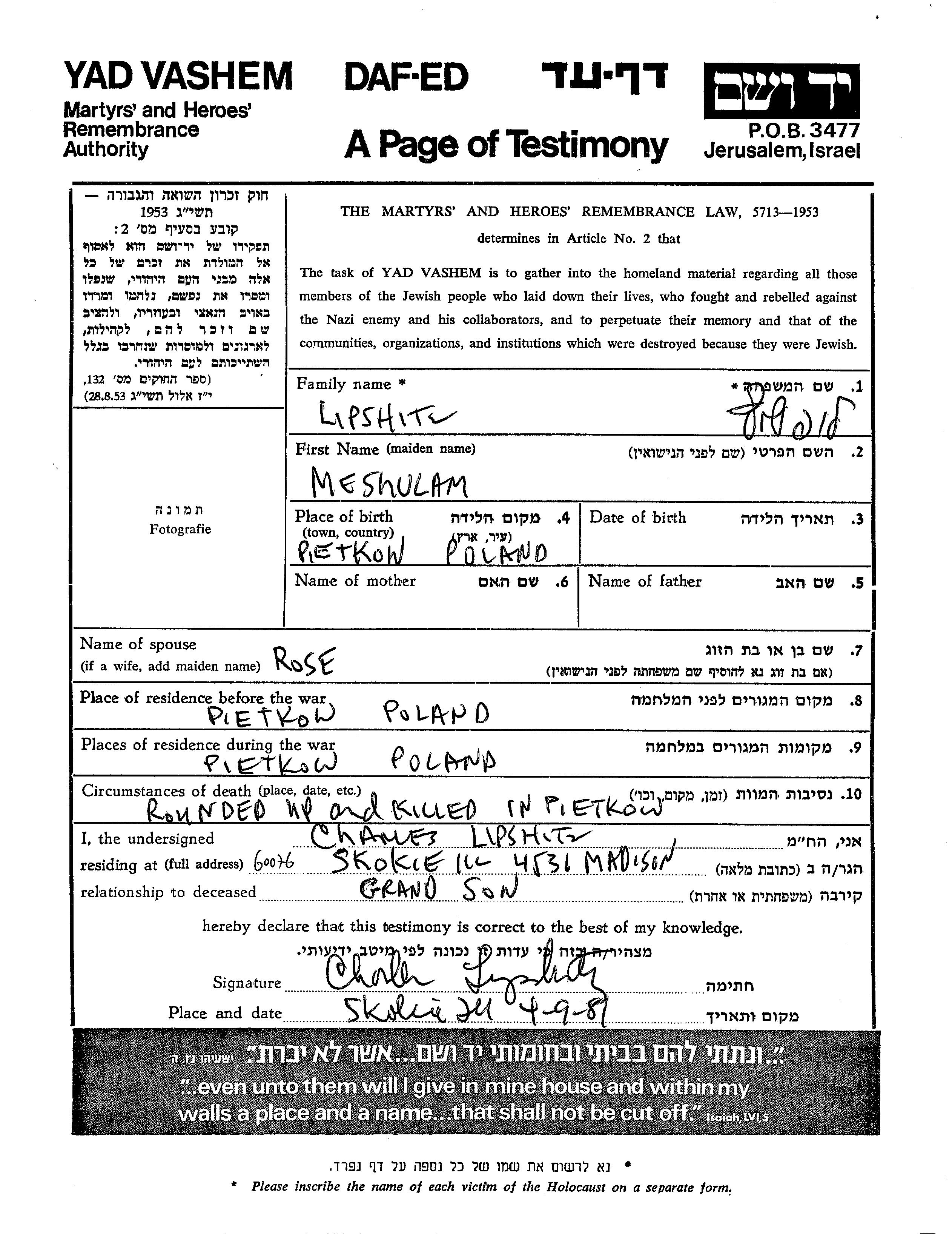 Lipshitz Meshulam Piotrkow, Pologne Feuille de témoignage