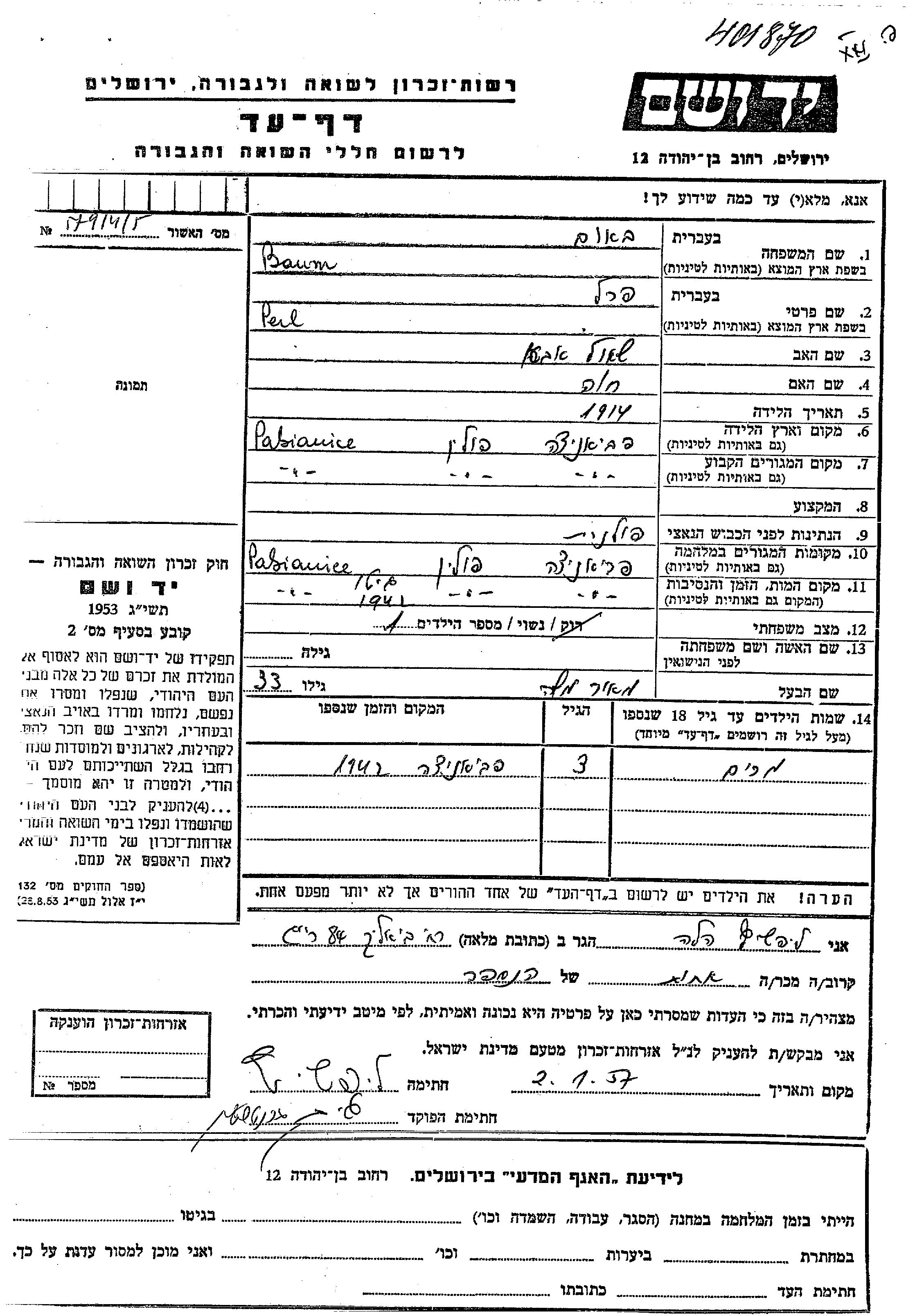 Perl Baum est née à Pabianice, Pologne en 1914, fille de Shaul Aba et de Khava. Elle était Mariée à Meir Moshe. Avant la seconde guerre mondiale elle vivait à Pabianice, Pologne. Pendant la guerre, elle était à Pabianice, Pologne.