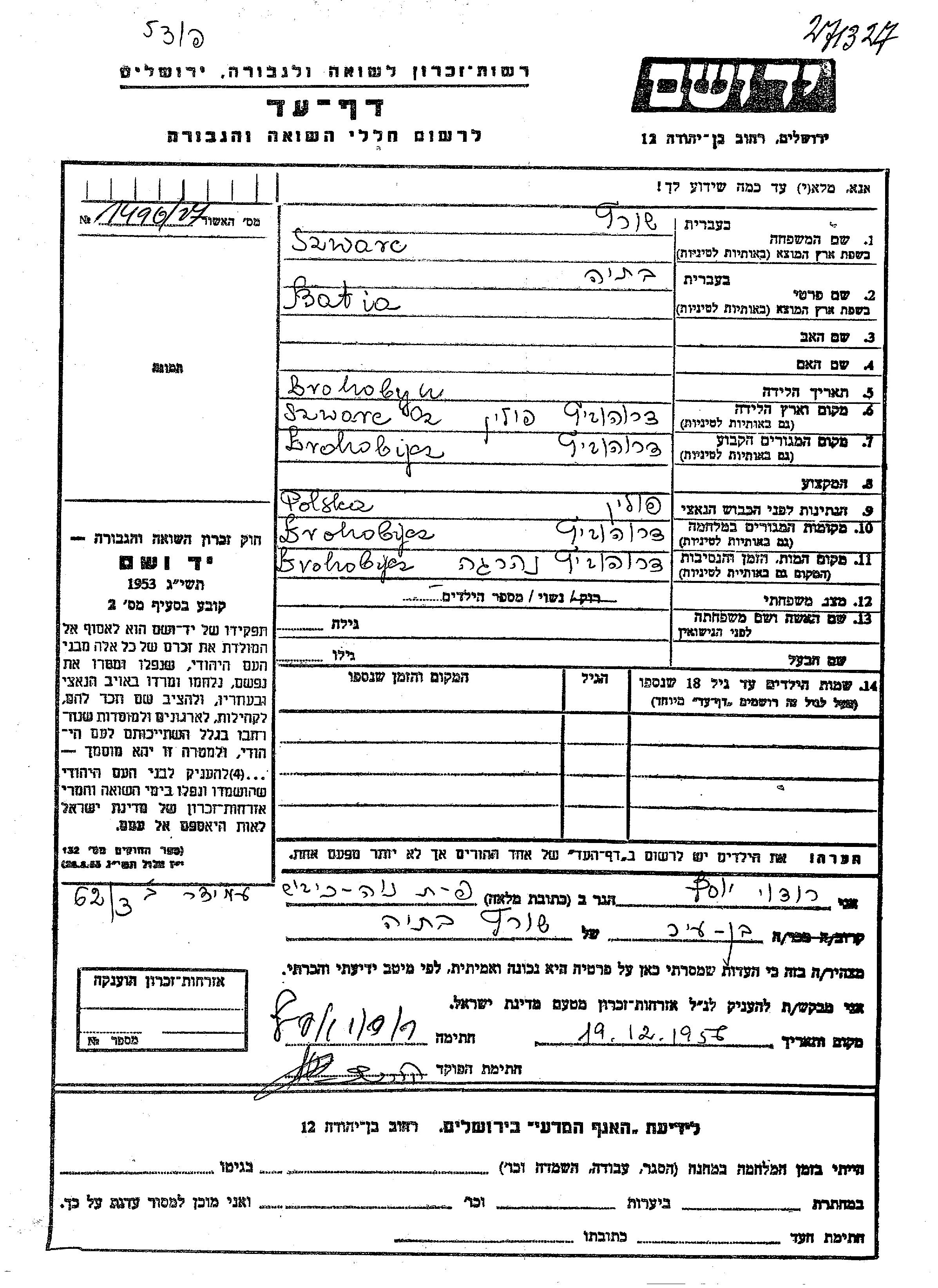 Szwarc Batia Drohobycz, Pologne Feuille de témoignage
