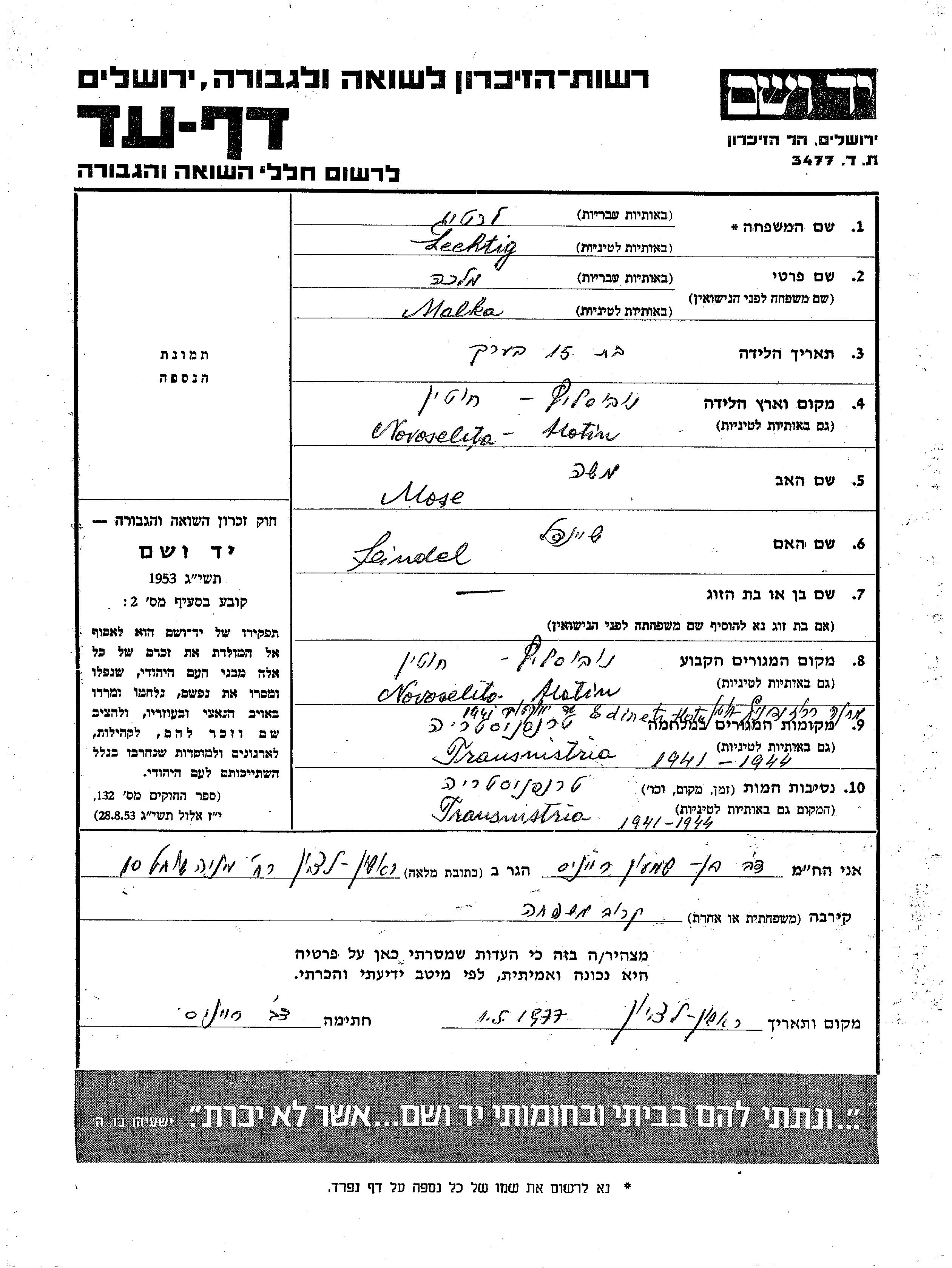 Lechtig Malka Novoselita, Roumanie Feuille de témoignage