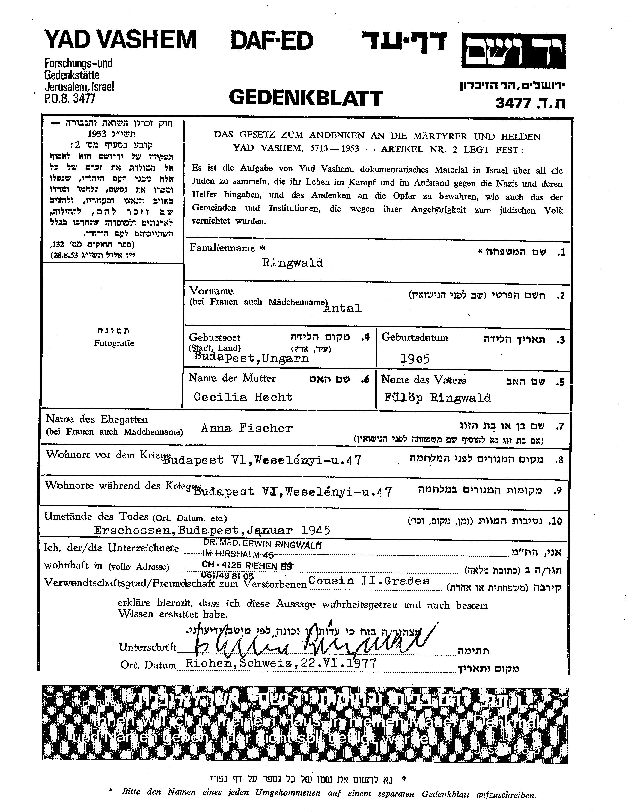 Antal Ringwald est né à Budapest, Hongrie en 1905, fils de Fulop et de Cecilia. Il était Mariée à Anna née Fischer. Avant la seconde guerre mondiale il vivait à Budapest, Hongrie. Au cours de la guerre, il était à Budapest, Hongrie.
