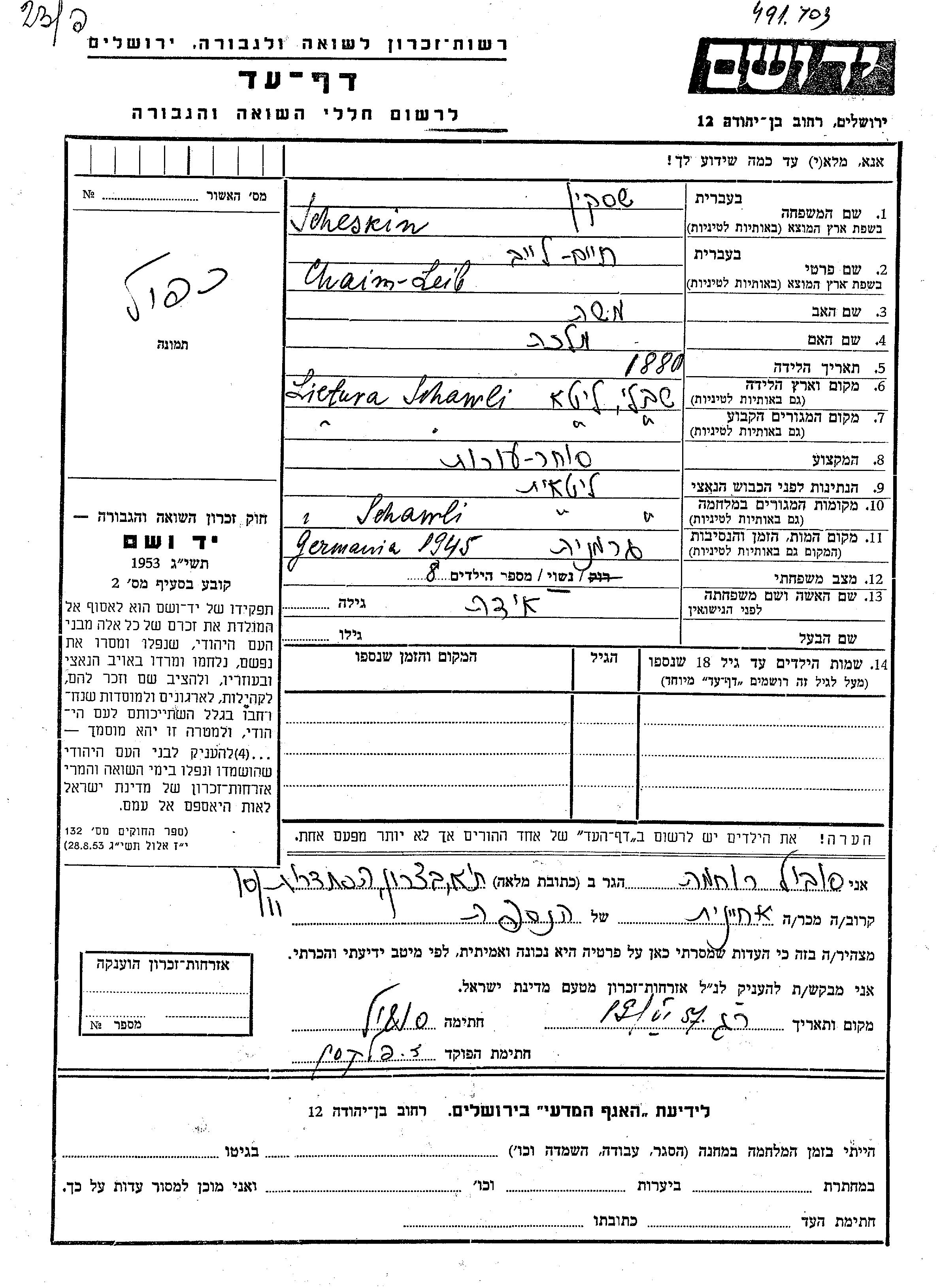 Chaim Leib Scheskin est né à Shawli, Lituanie en 1880, fils de Moshe et de Malka. Il était Maroquinier et Mariée à Ida. Avant la seconde guerre mondiale il vivait à Shawli, Lituanie. Au cours de la guerre, il était à Shawli, Lituanie.