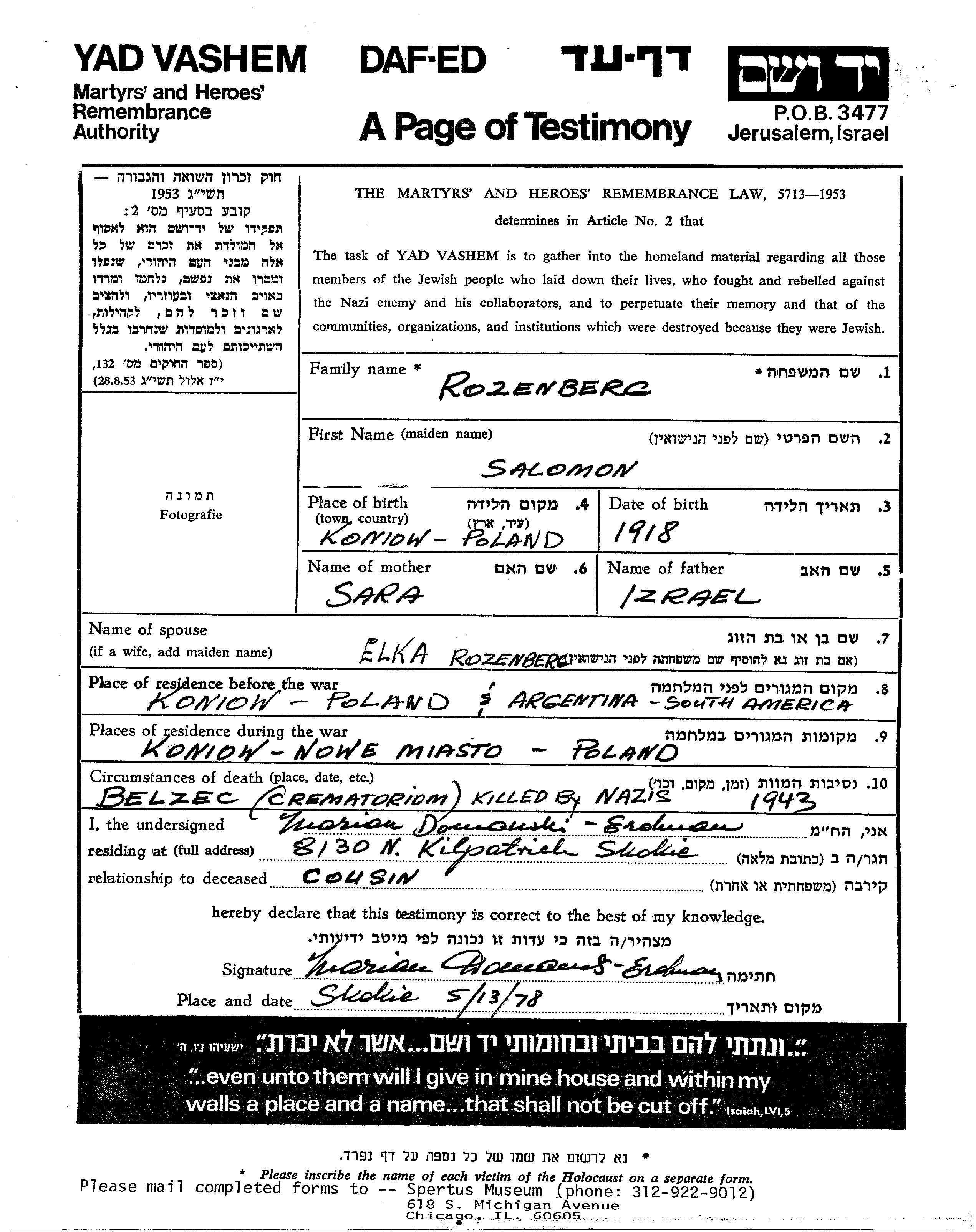 Salomon Rozenberg est né à Koniow, Pologne en 1918, fils de Izrael et de Sara. Il était Mariée à Elka. Avant la seconde guerre mondiale il vivait à Koniow, Pologne. Au cours de la guerre, il était à Nowe Miasto, Pologne.