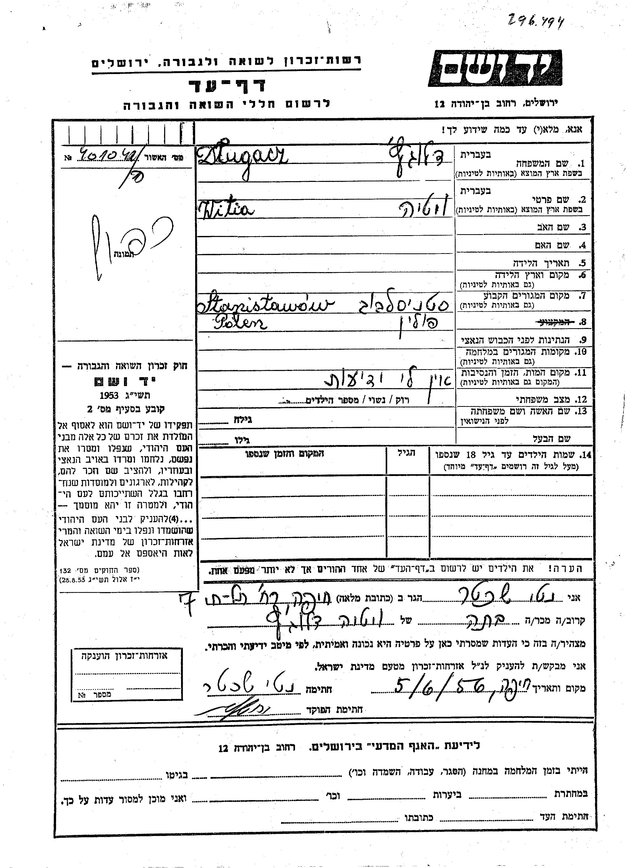 Dlugacz Witia Stanislawow, Pologne Feuille de témoignage