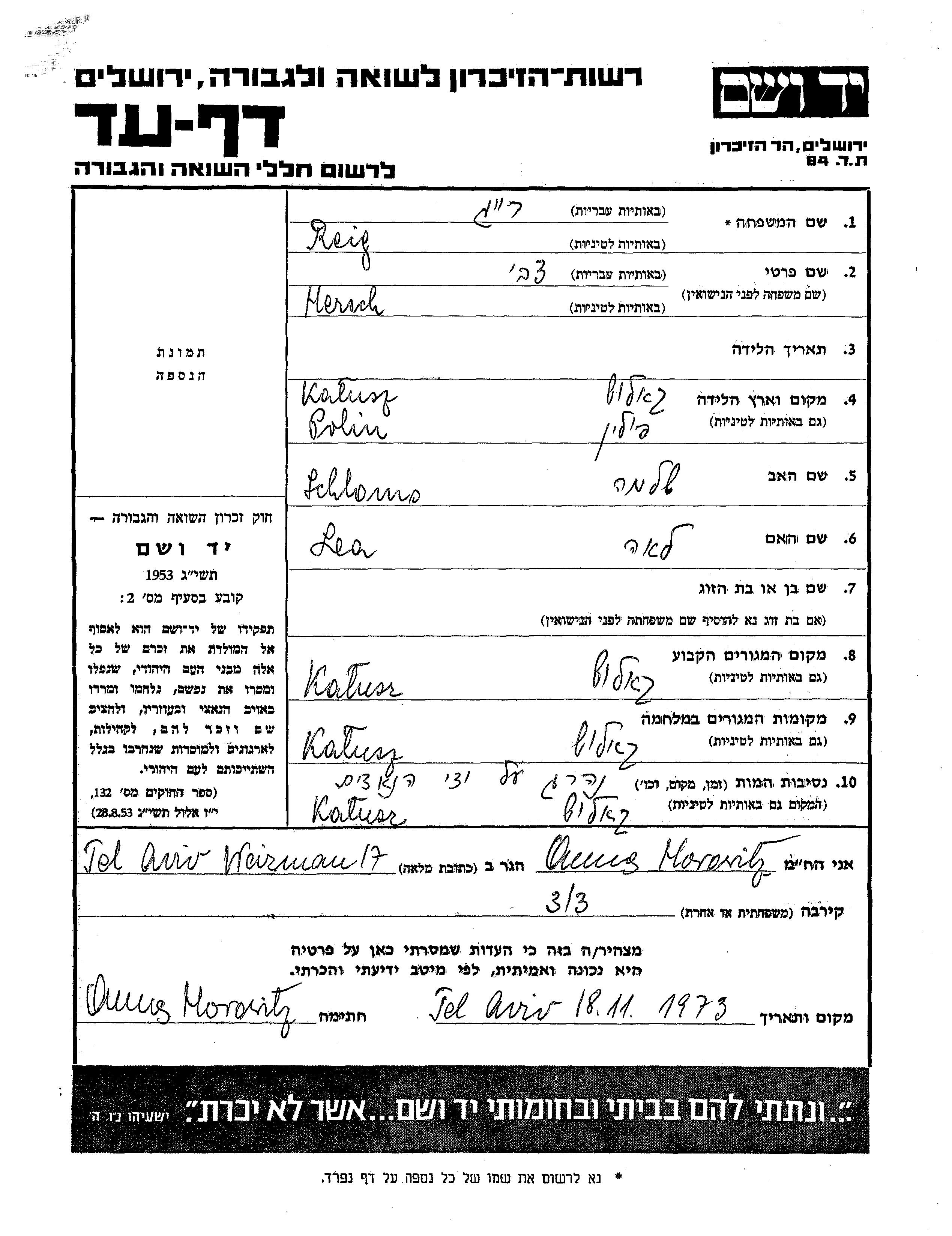 Reig Hersch Tzvi Kalisz, Pologne Feuille de témoignage
