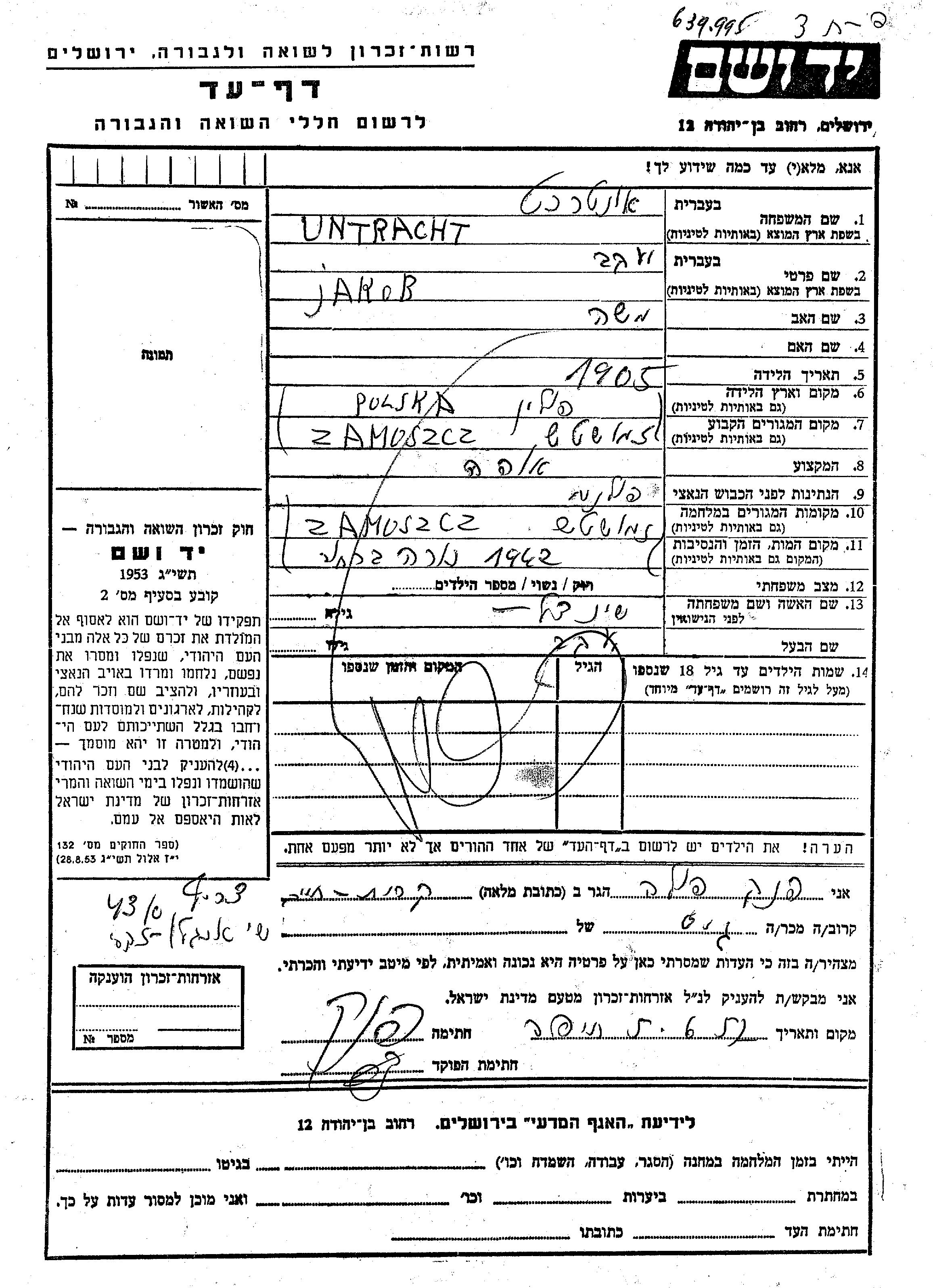 Untracht Jakob 1905 Zamosc, Pologne Feuille de témoignage