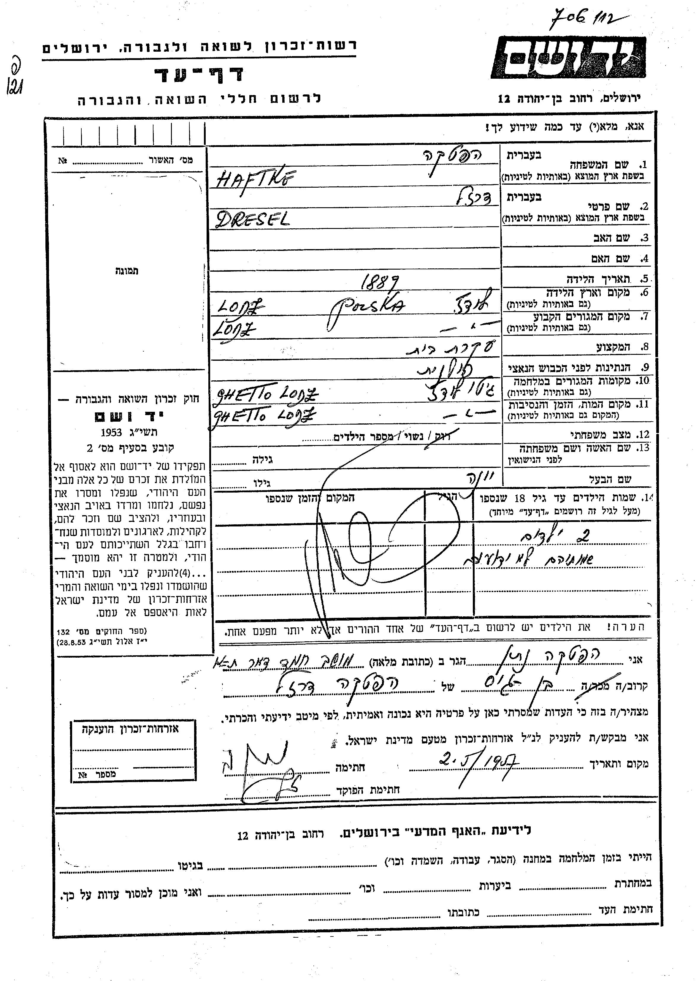 Dreiza Haftke est née à Lodz, Pologne en 1889. Elle était Femme au foyer et Mariée à Yona. Avant la seconde guerre mondiale elle vivait à Lodz, Pologne. Pendant la guerre, elle était à Lodz, Pologne.