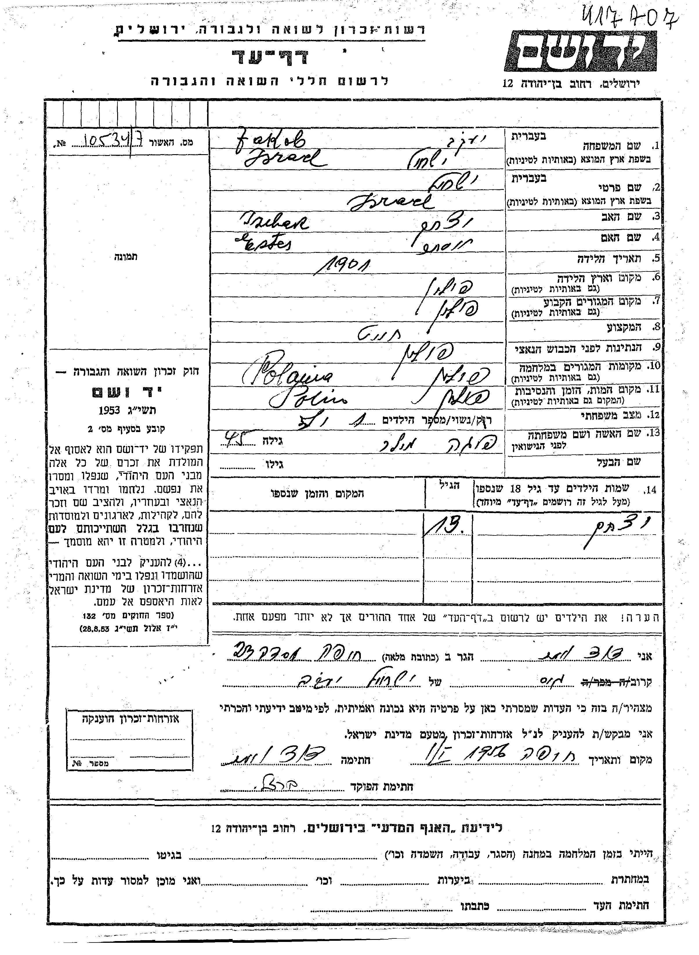 Yad Vashem - Pages of Testimony Names Memorial Collection