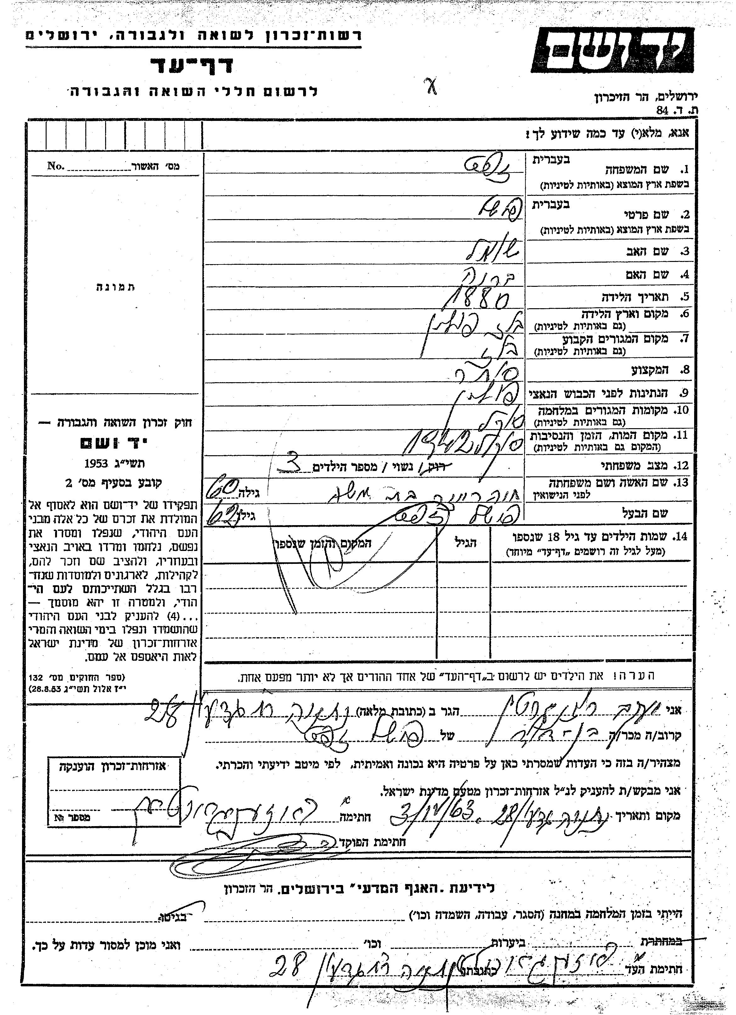 Yad Vashem - Pages of Testimony Names Memorial Collection