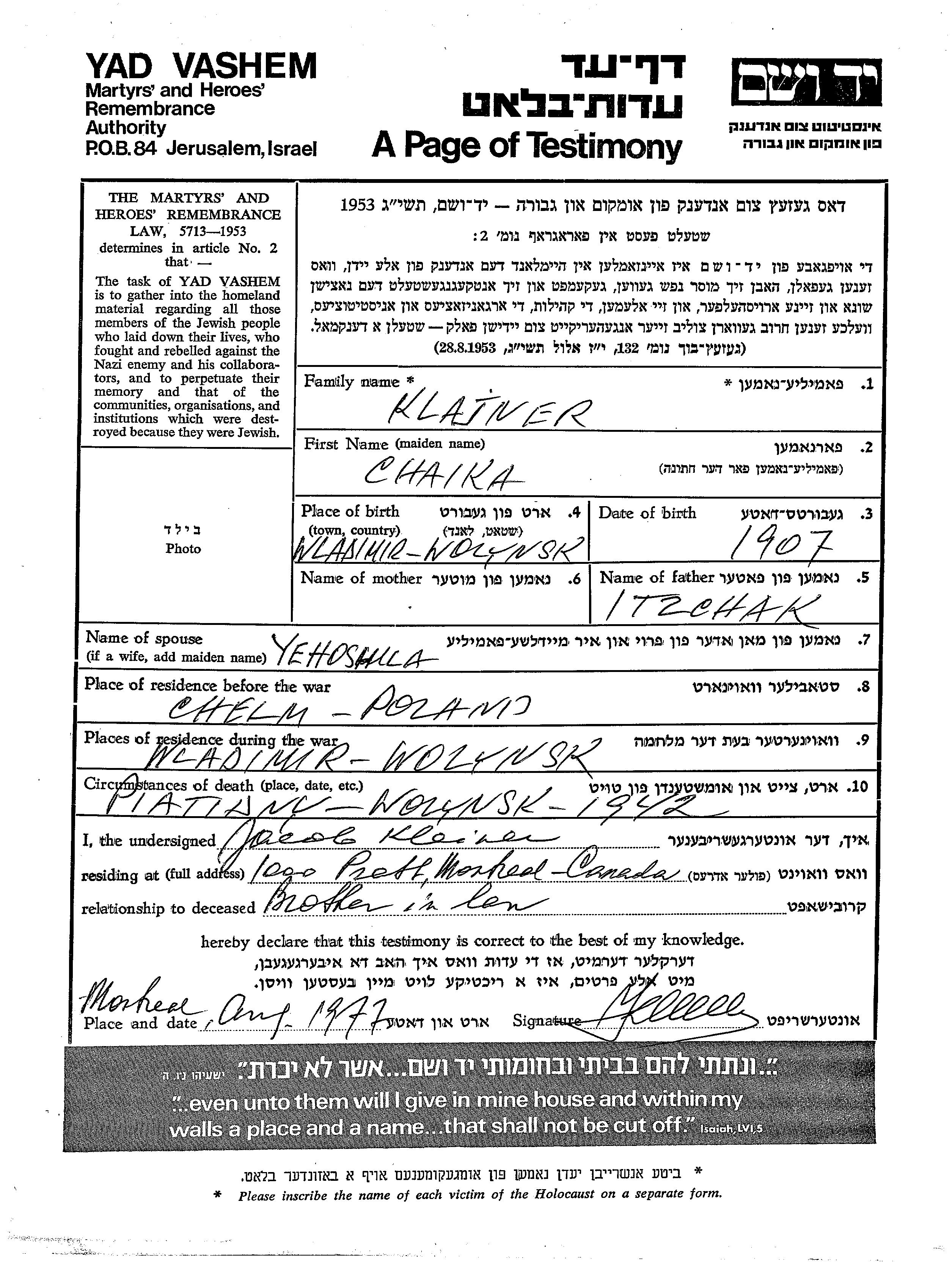 Klajner Chaika 1907 Chelm, Pologne Feuille de témoignage
