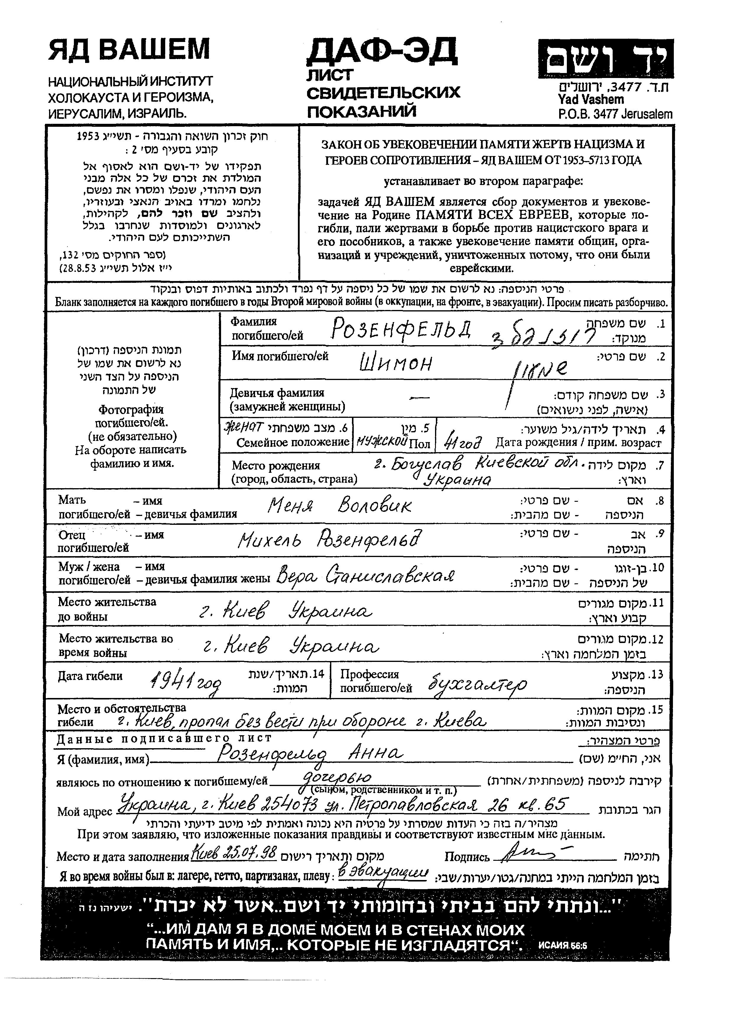 Shimon Rozenfeld est né à Boguslav, Ukraine (URSS), fils de Mikhel et de Menya. Il était Comptable et Mariée à Vera née Stanislavski. Avant la seconde guerre mondiale il vivait à Kiyev, Ukraine (URSS). Au cours de la guerre, il était à Kiyev, Ukraine (URSS).