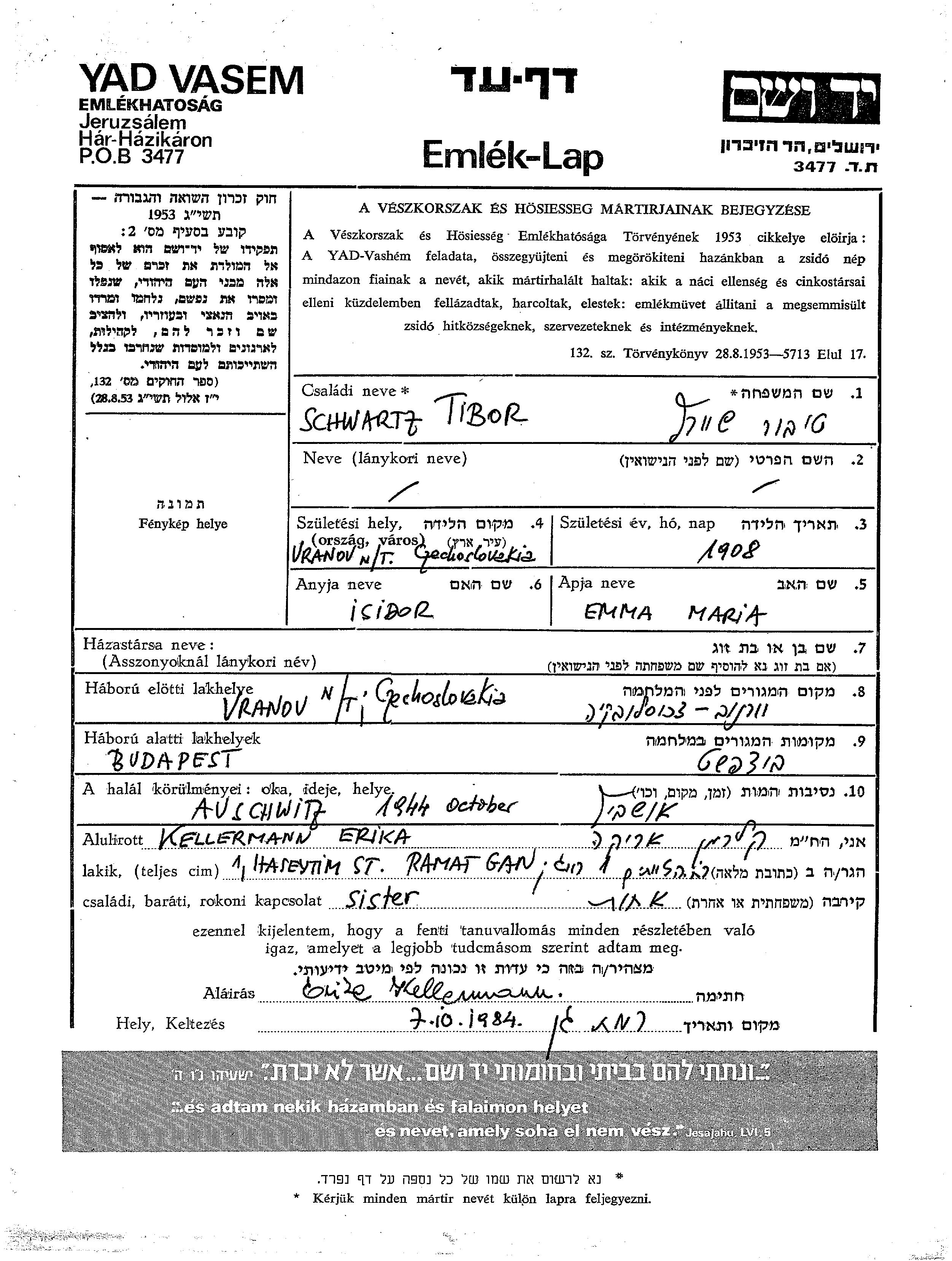 Schwartz Tibor 1908 Vranov, Tchécoslovaquie Feuille de témoignage