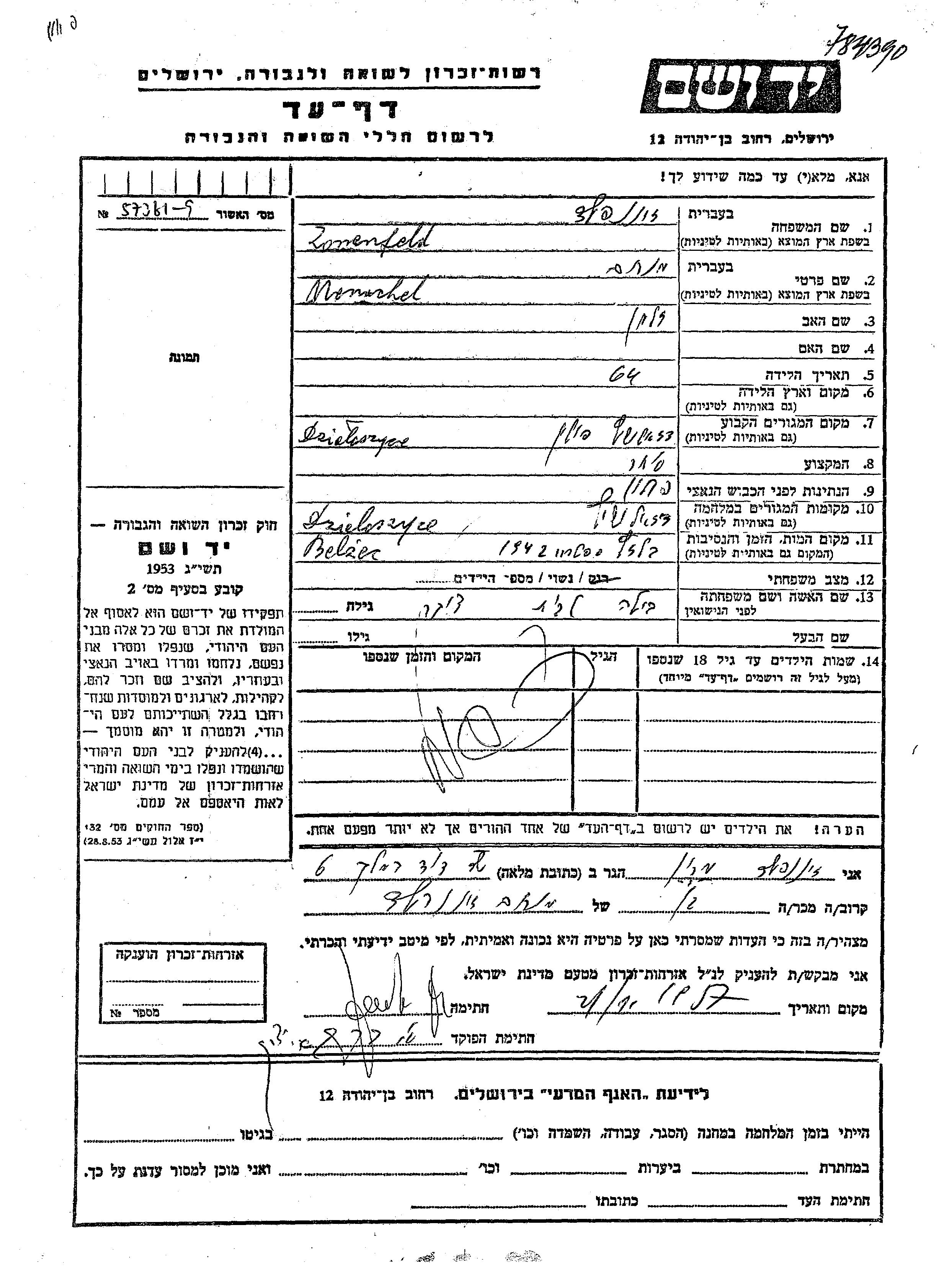Menachel Zonenfeld est né fils de Zalman. Il était Commerçant/e et Mariée à Bila née Tshuva. Avant la seconde guerre mondiale il vivait à Dzielosic, Pologne. Au cours de la guerre, il était à Dzielosic, Pologne.