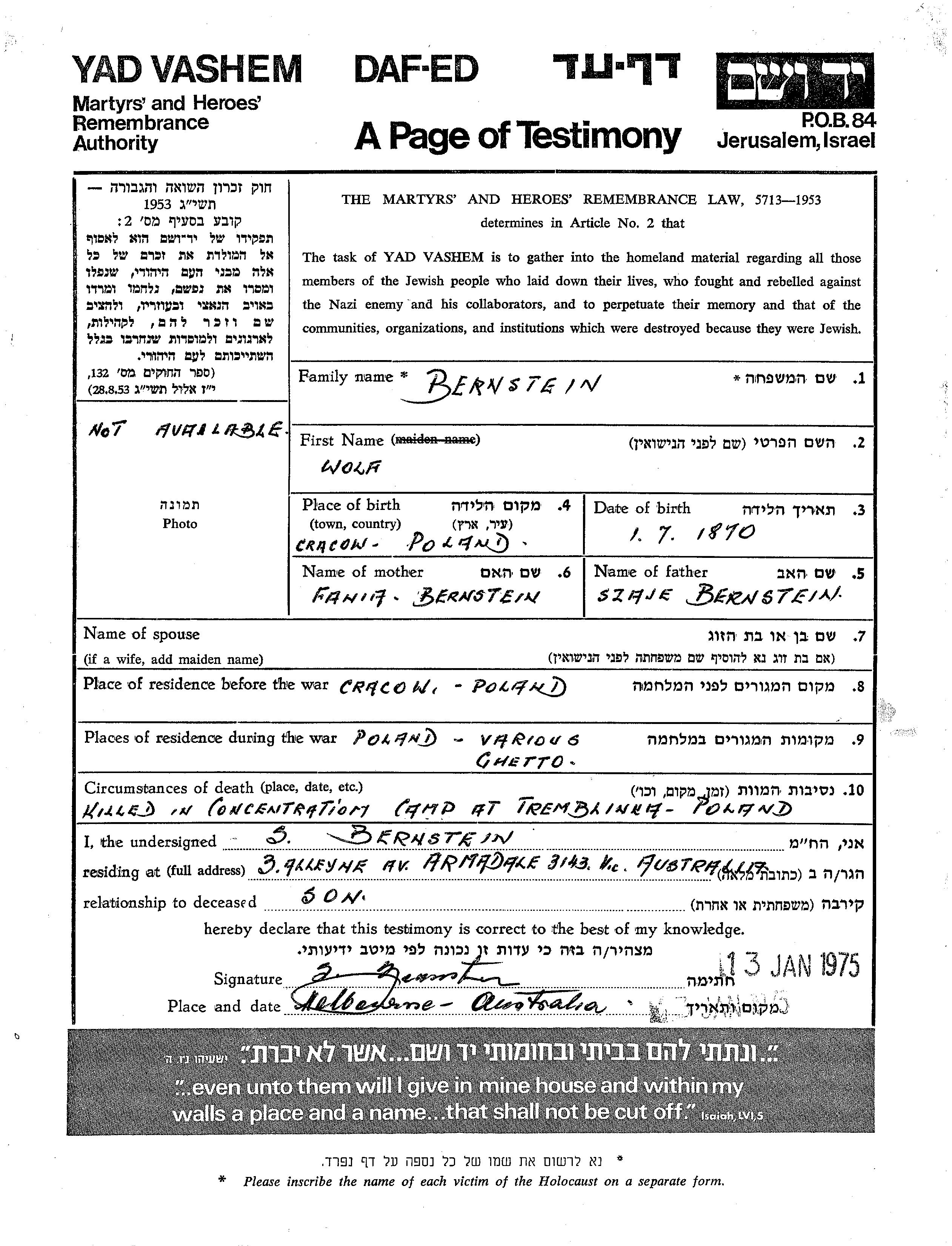 Wolf Bernstein est né à Cracow, Pologne en 1870, fils de Szaje et de Fania. Avant la seconde guerre mondiale il vivait à Cracow, Pologne. Au cours de la guerre, il était à Cracow, Pologne.