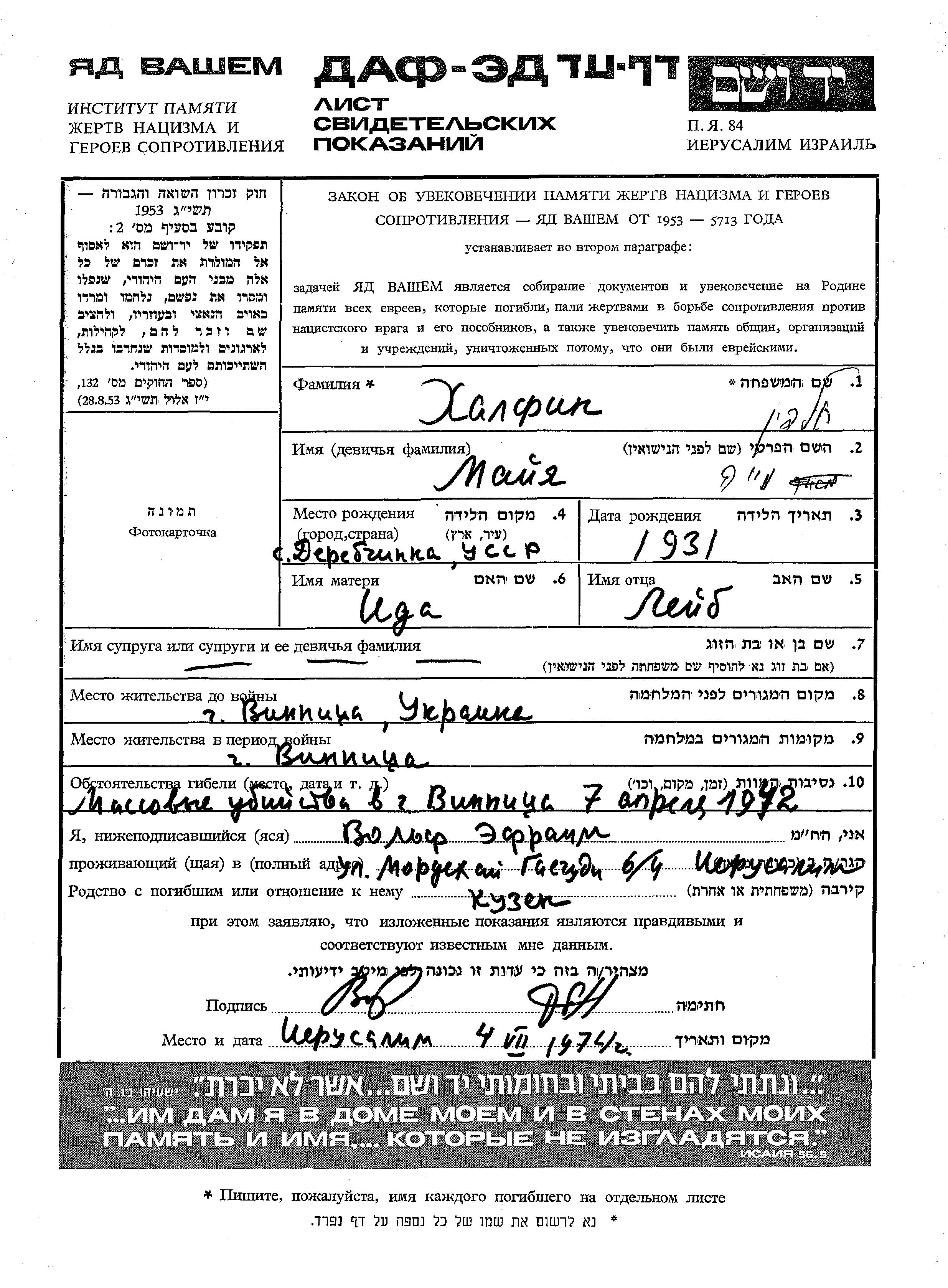 Khalfin Maja 1931 Vinnitza, Ukraine (URSS) Feuille de témoignage