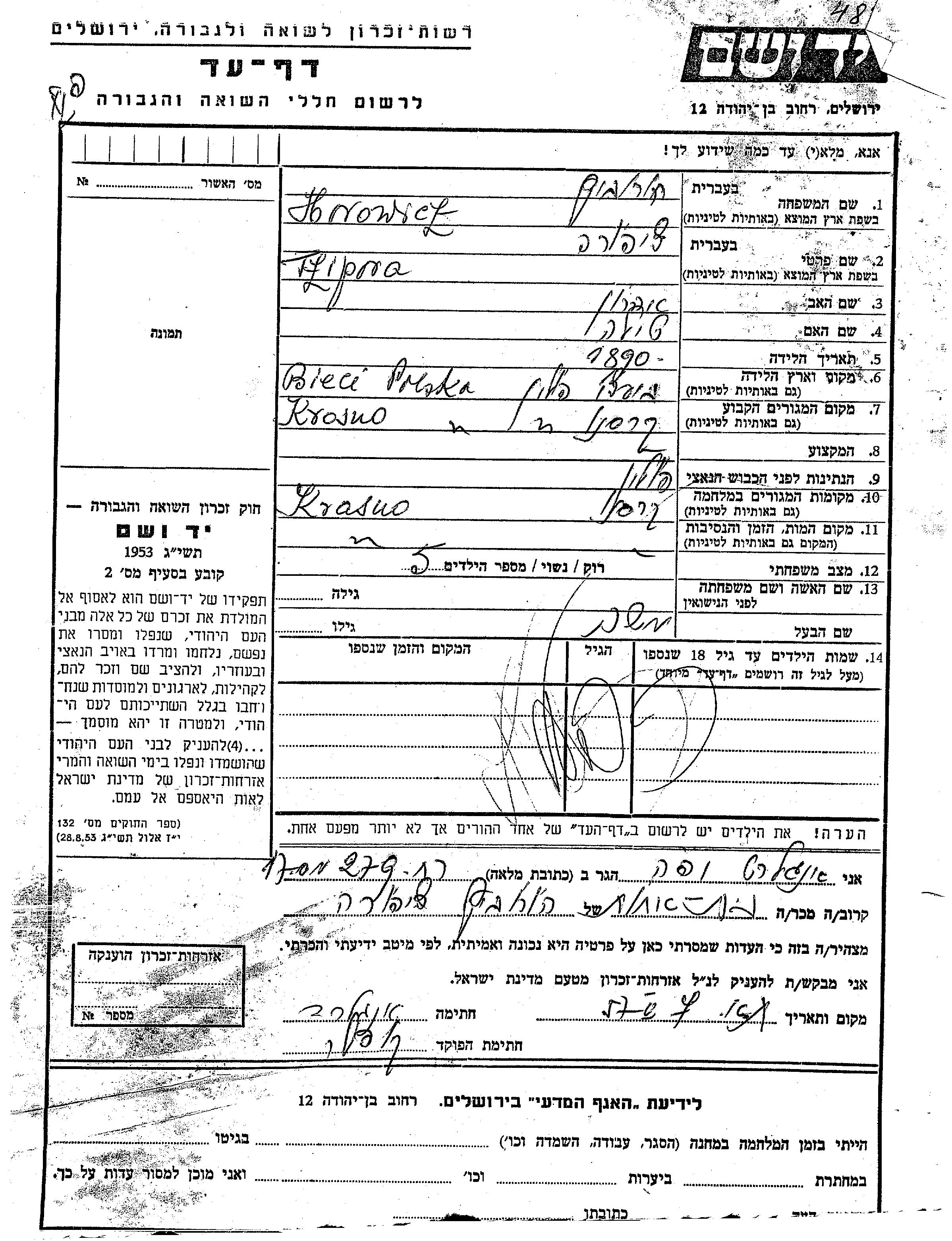 Horowicz Tzipora 1890 Krosno, Pologne Feuille de témoignage