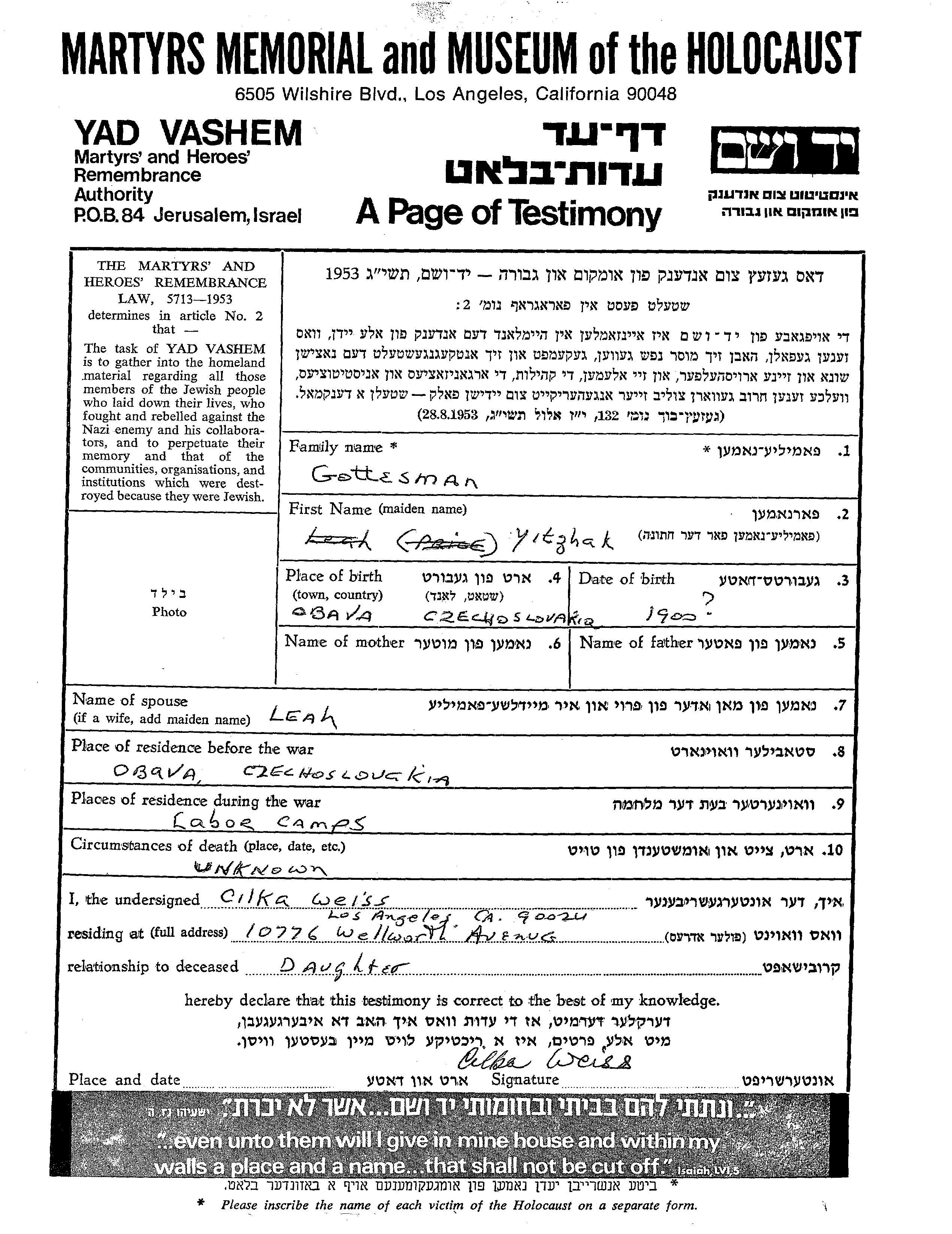 Gottesman Yitzhak 1900 Obava, Tchécoslovaquie Feuille de témoignage