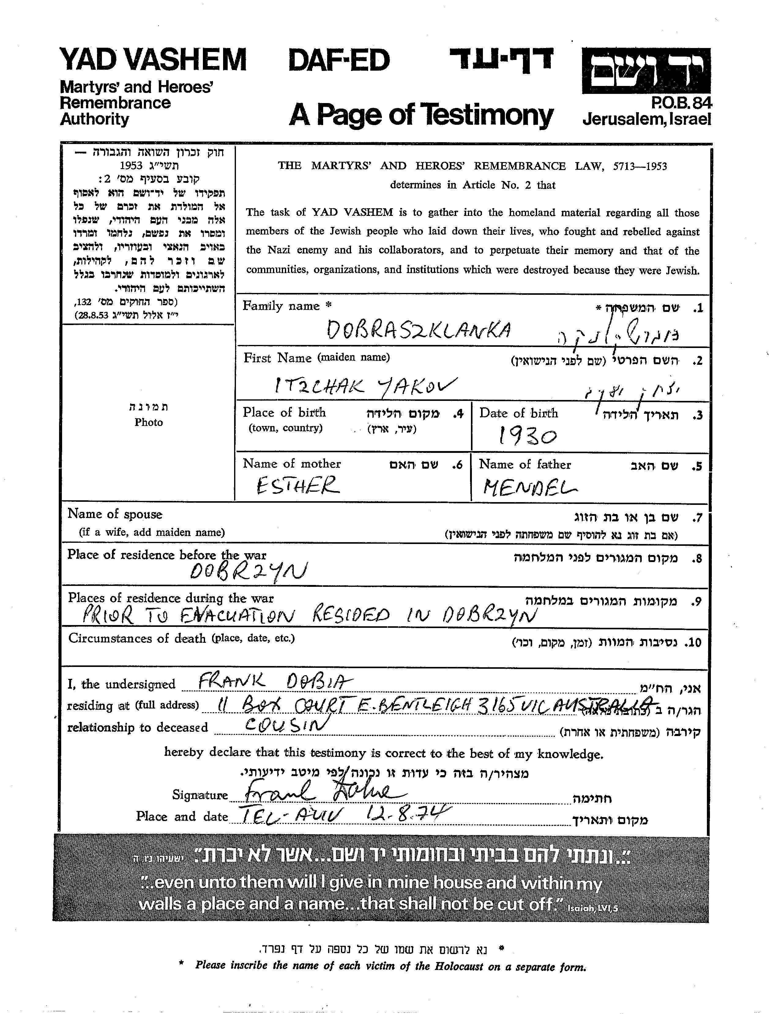 Dobraszklanka Itzchak Jakov 1930 Dobrzyn, Pologne Feuille de témoignage