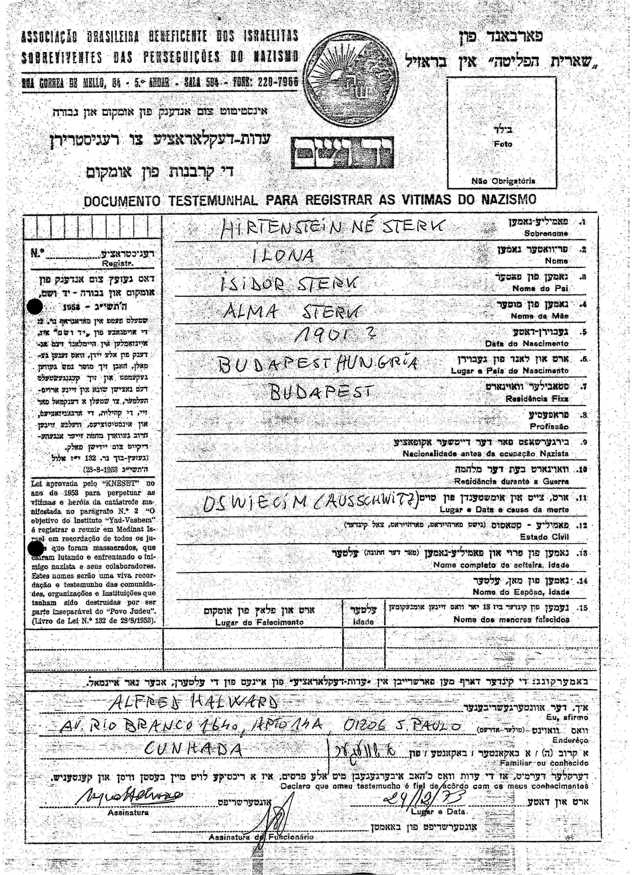 Hirtenstein Ilona 1901 Budapest, Hongrie Feuille de témoignage