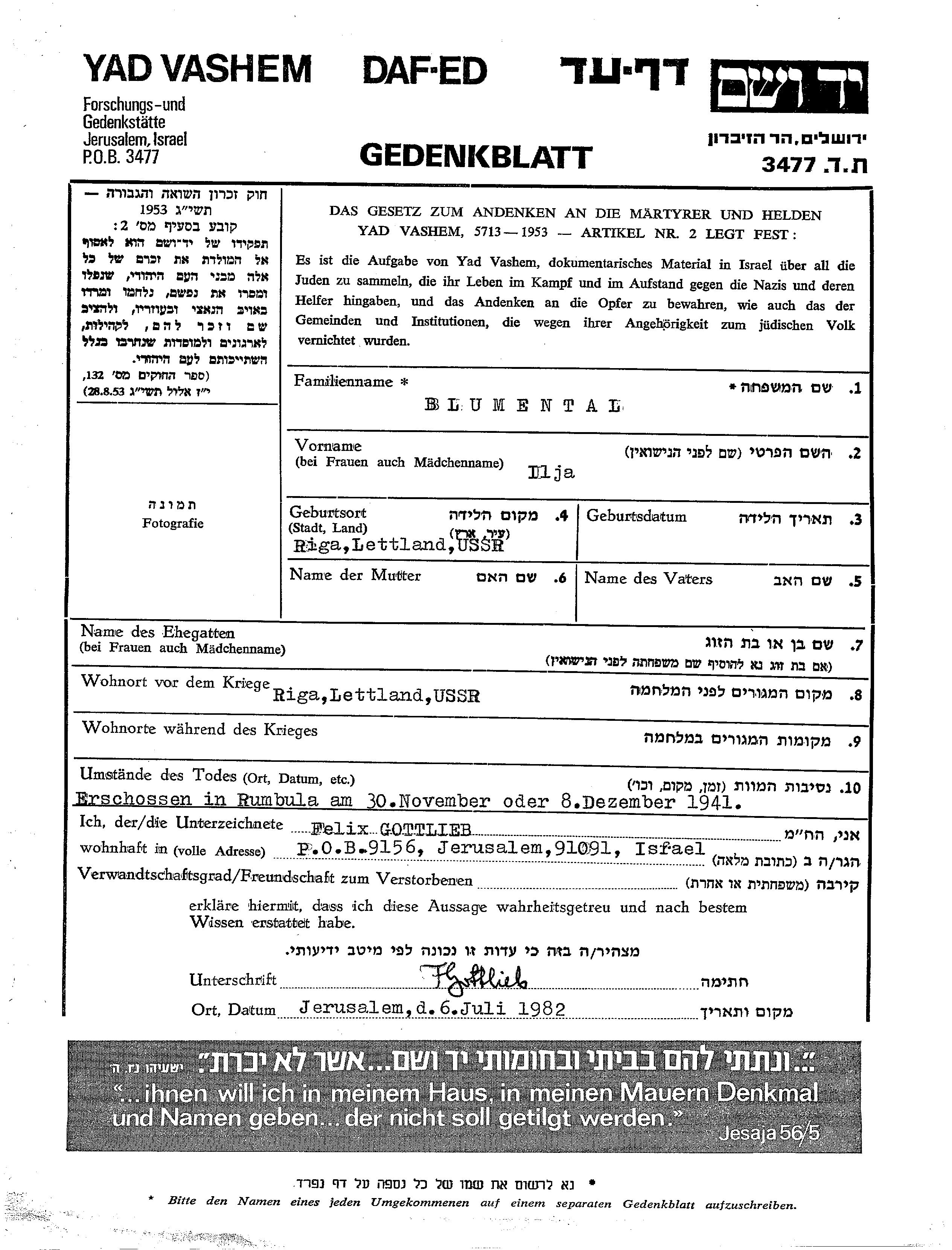 Blumental Ilja endroit inconnu, Feuille de témoignage