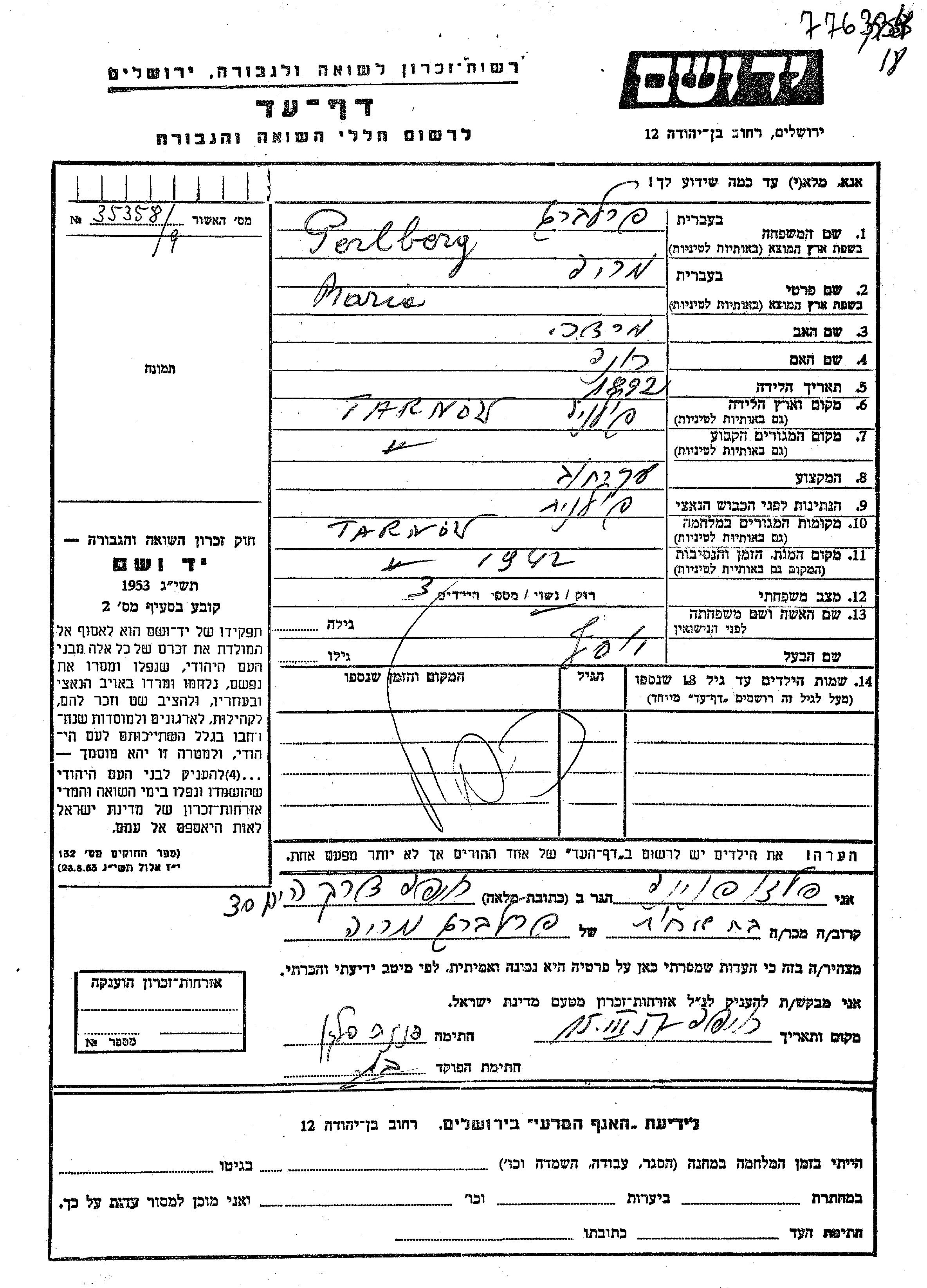 Maria Perlberg est née à Tarnow, Pologne en 1892, fille de Mordekhai et de Rona. Elle était Femme au foyer et Mariée à Yosef. Avant la seconde guerre mondiale elle vivait à Tarnow, Pologne. Pendant la guerre, elle était à Tarnow, Pologne.