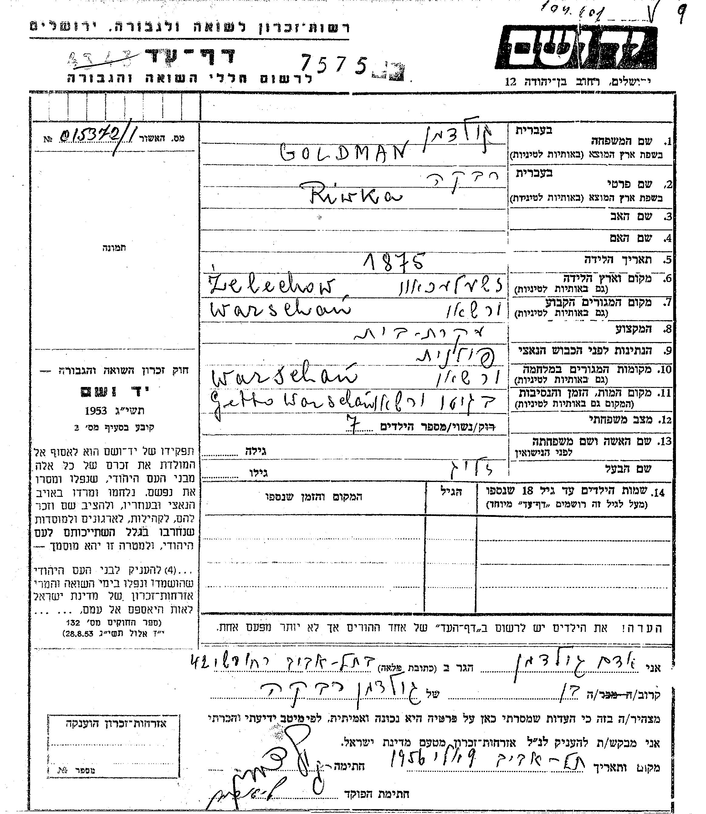 Riwka Goldman est née à Zielechow, Pologne en 1875. Elle était Femme au foyer et Mariée à Zelig. Avant la seconde guerre mondiale elle vivait à Warschau, Pologne. Pendant la guerre, elle était à Warschau, Pologne.