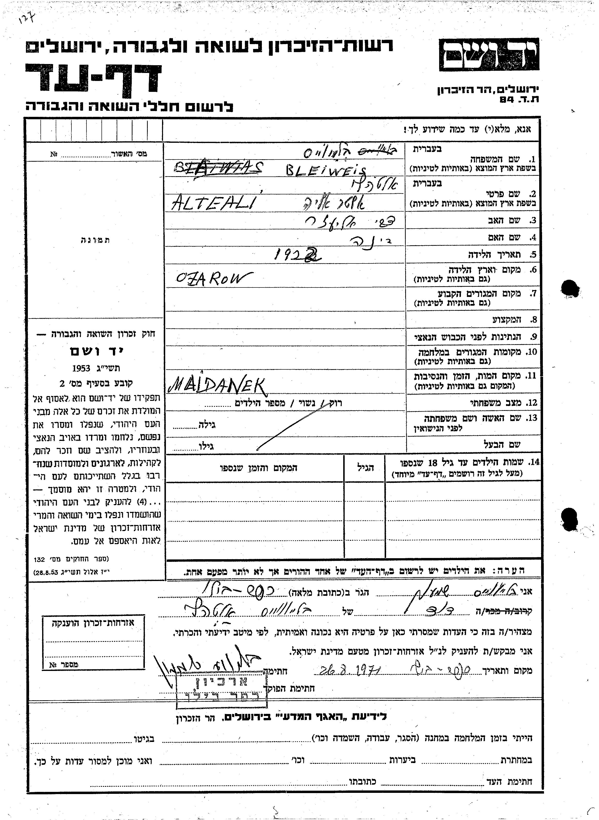 Bleiweis Alteali Alia 1922 endroit inconnu, Feuille de témoignage