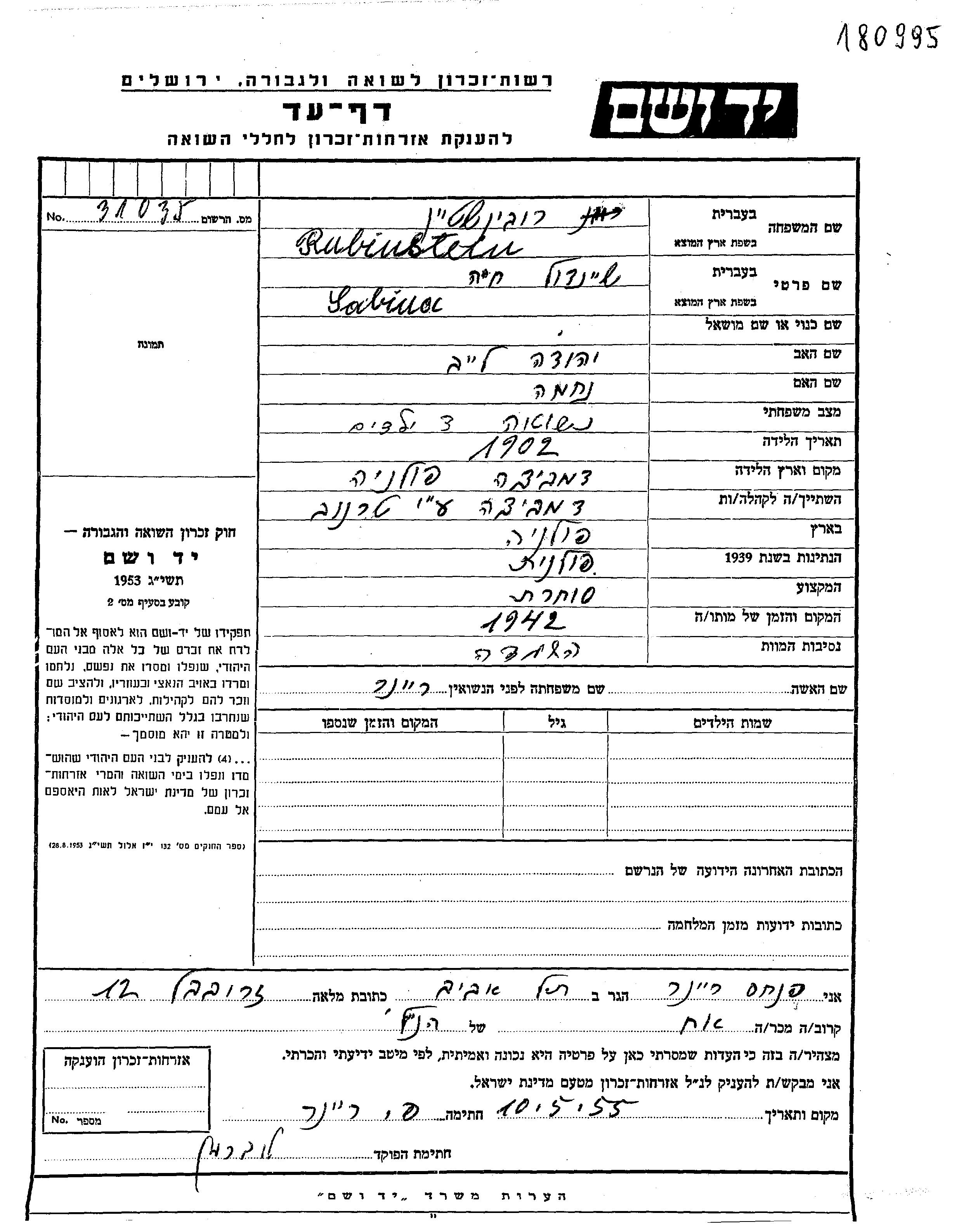 Rubinstein Sheina Khaia Sabina 1902 Debica, Pologne Feuille de témoignage