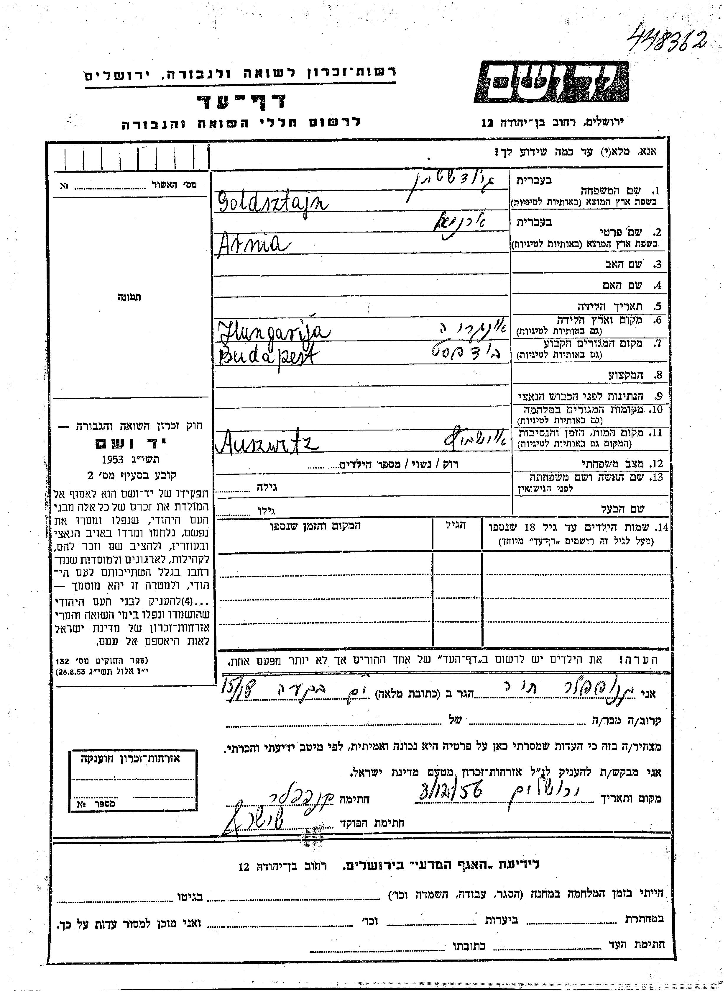 Goldsztajn Arnia Budapest, Hongrie Feuille de témoignage