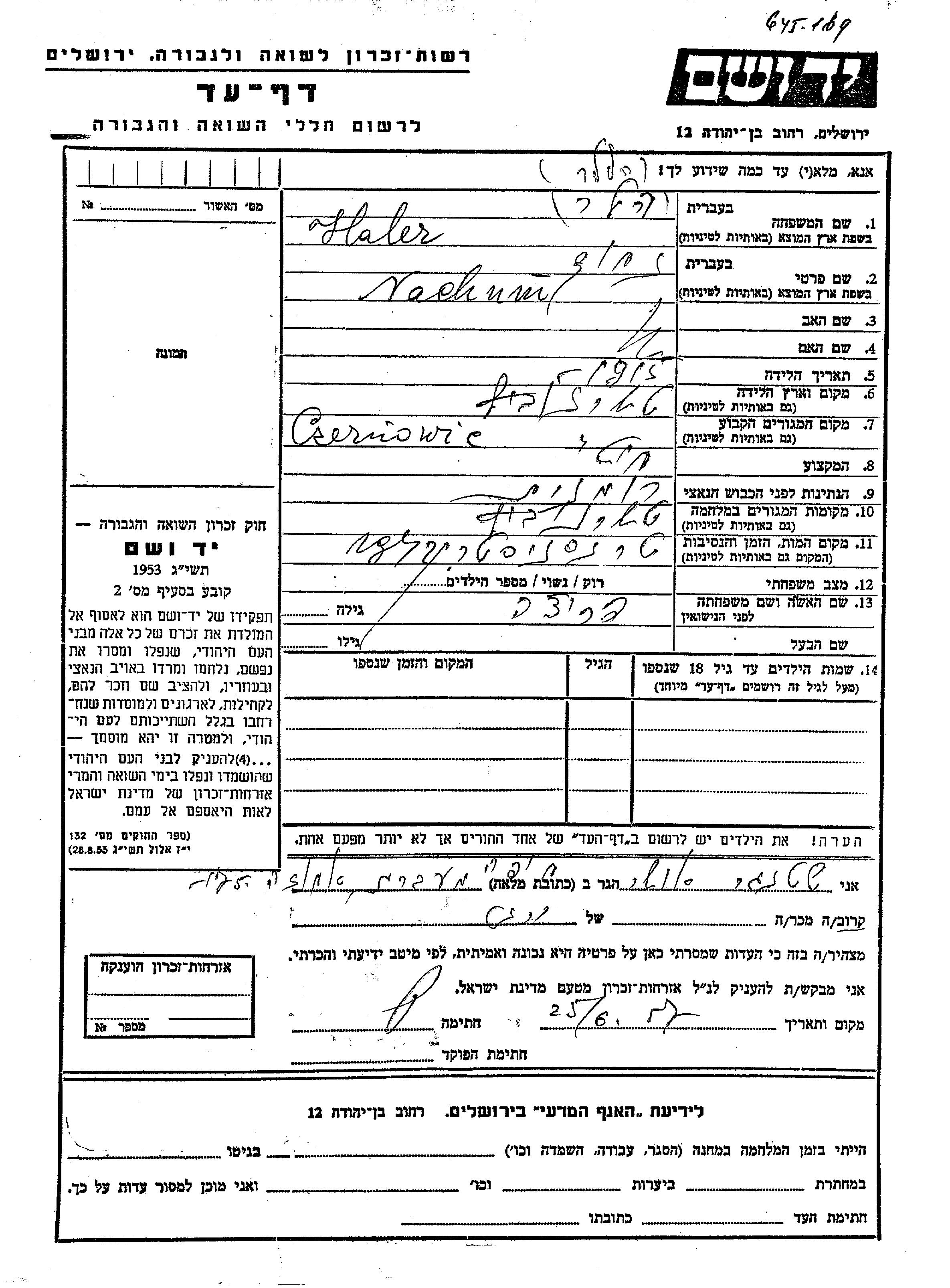 Haler Heler Nachum 1915 Czernowitz, Roumanie Feuille de témoignage