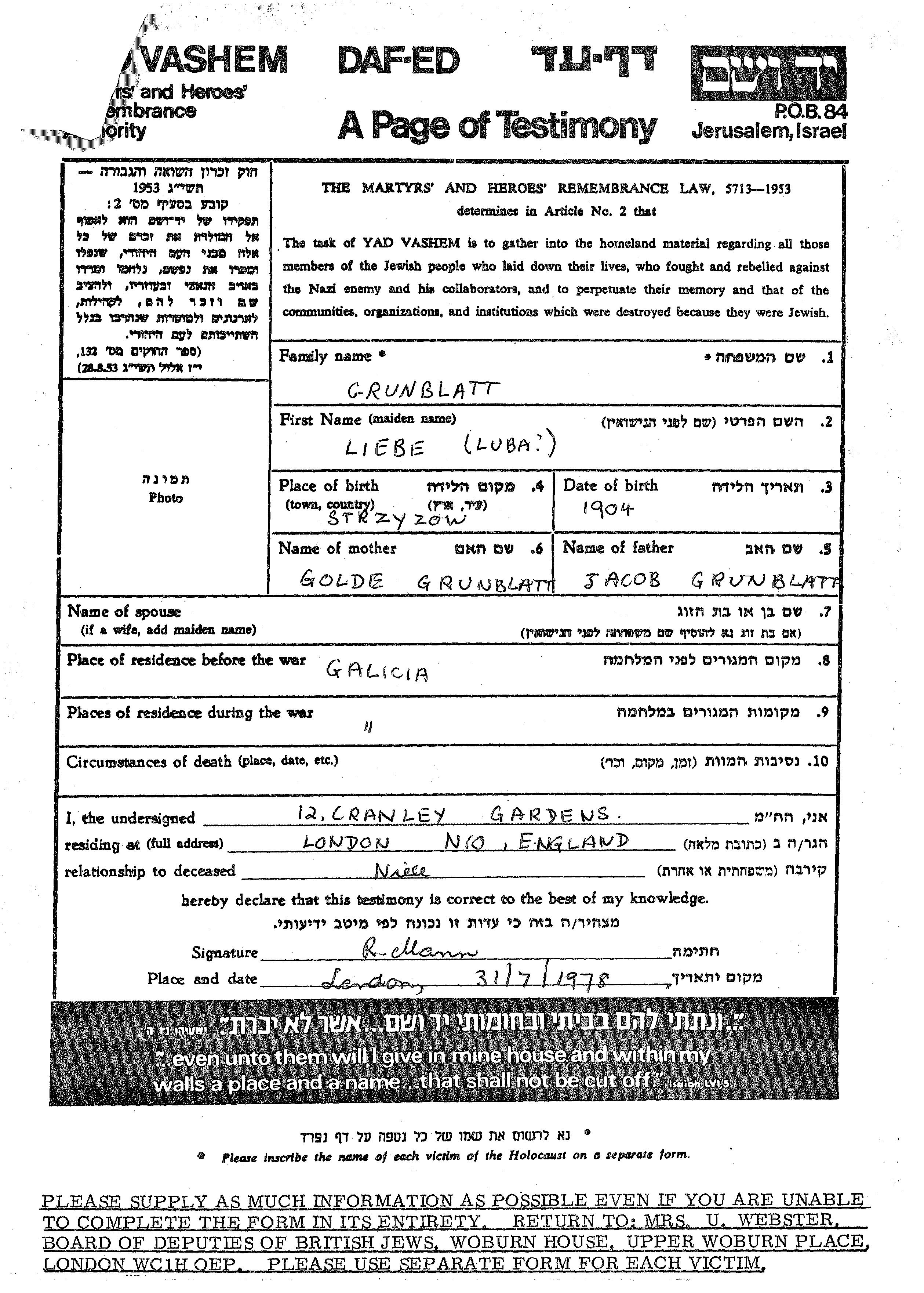 Liebe Luba Grunblatt est née à Strzyzow, Pologne en 1904, fille de Jacob et de Golda. Avant la seconde guerre mondiale elle vivait à Galicia Region, Pologne. Pendant la guerre, elle était à Galicia Region, Pologne.