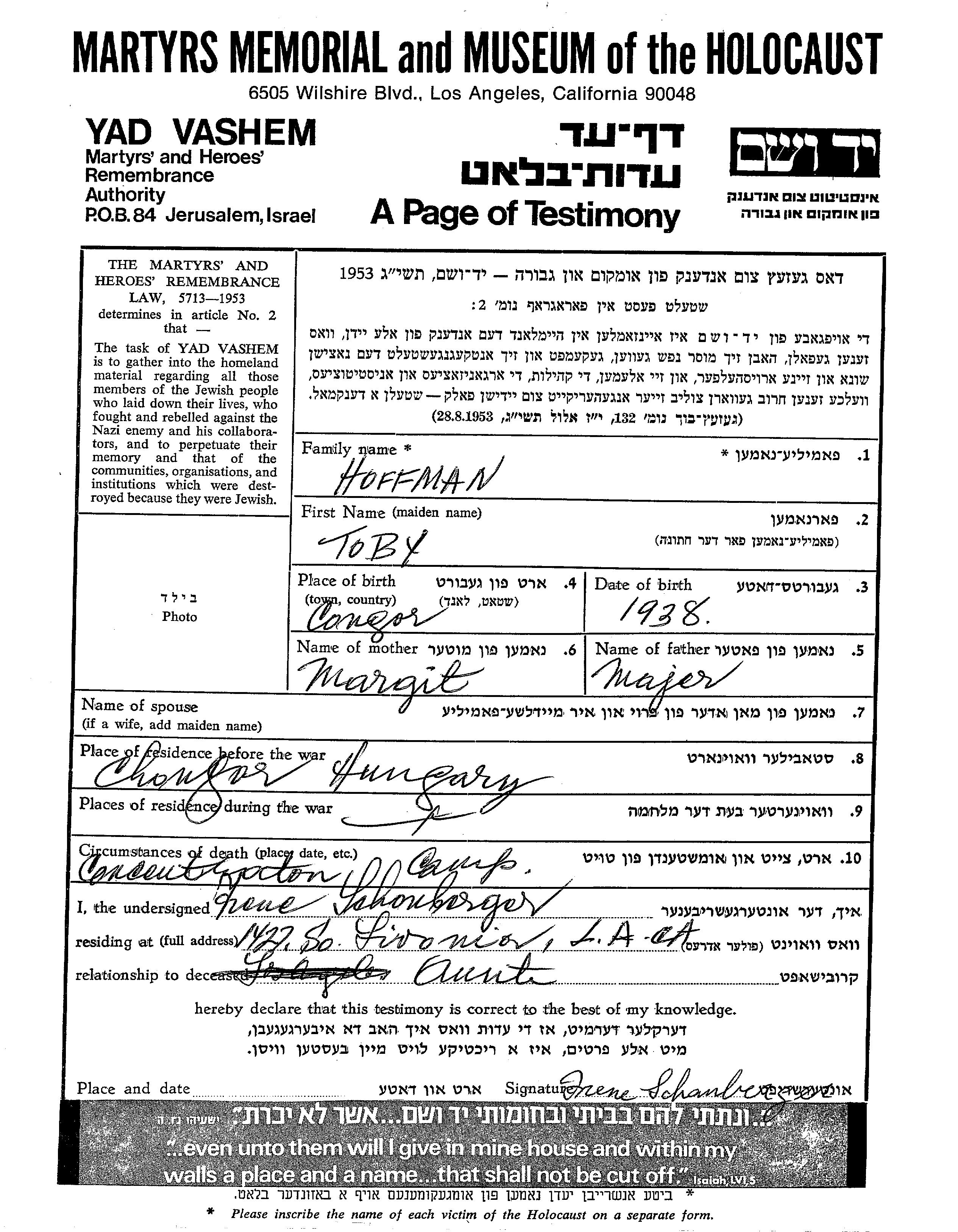Toby Hoffman est née à Csongor, Tchécoslovaquie en 1938, fille de Majer et de Margit. Avant la seconde guerre mondiale elle vivait à Chongar, Hongrie.