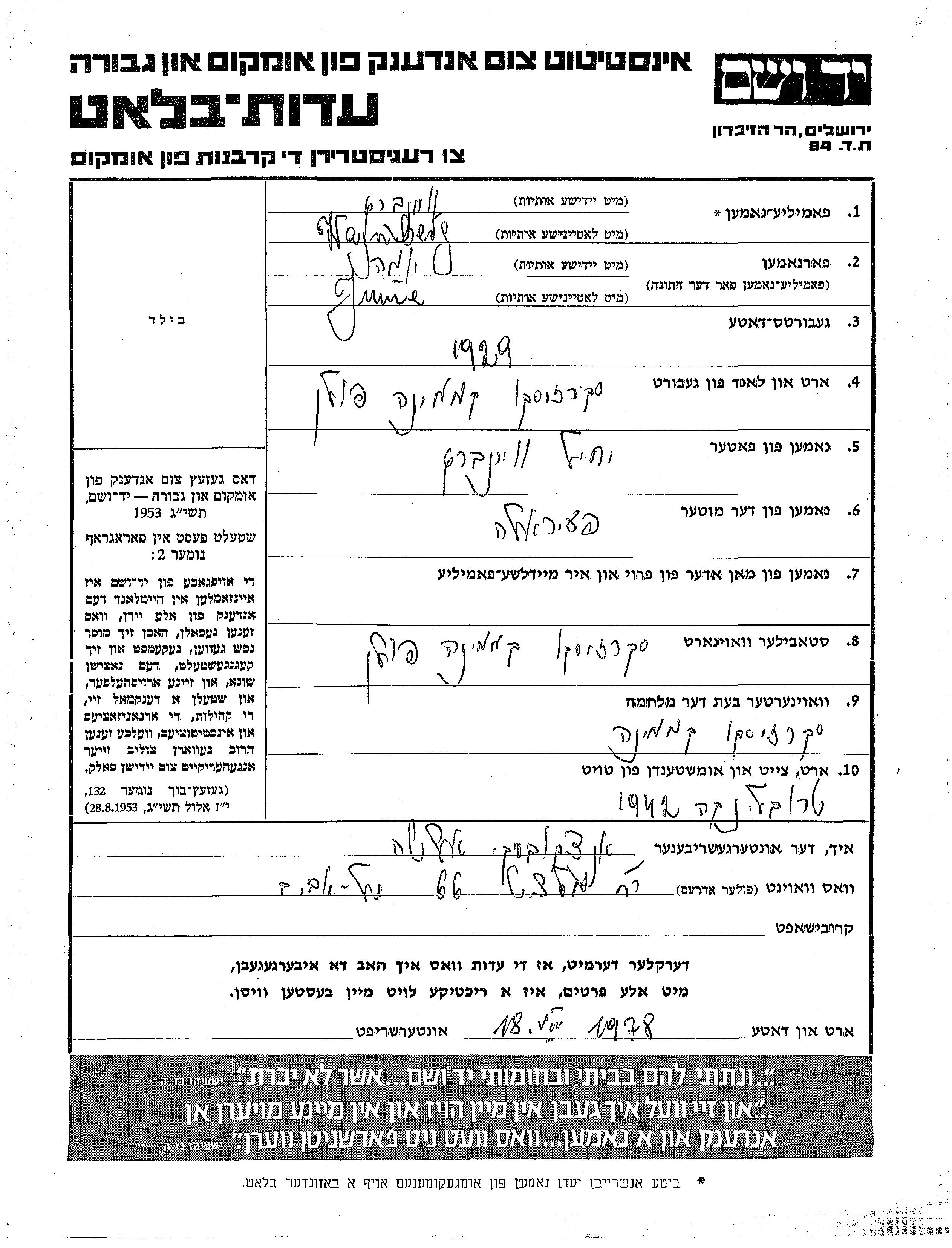 Wajnberg Jume 1929 Skarzysko Kamienna, Pologne Feuille de témoignage