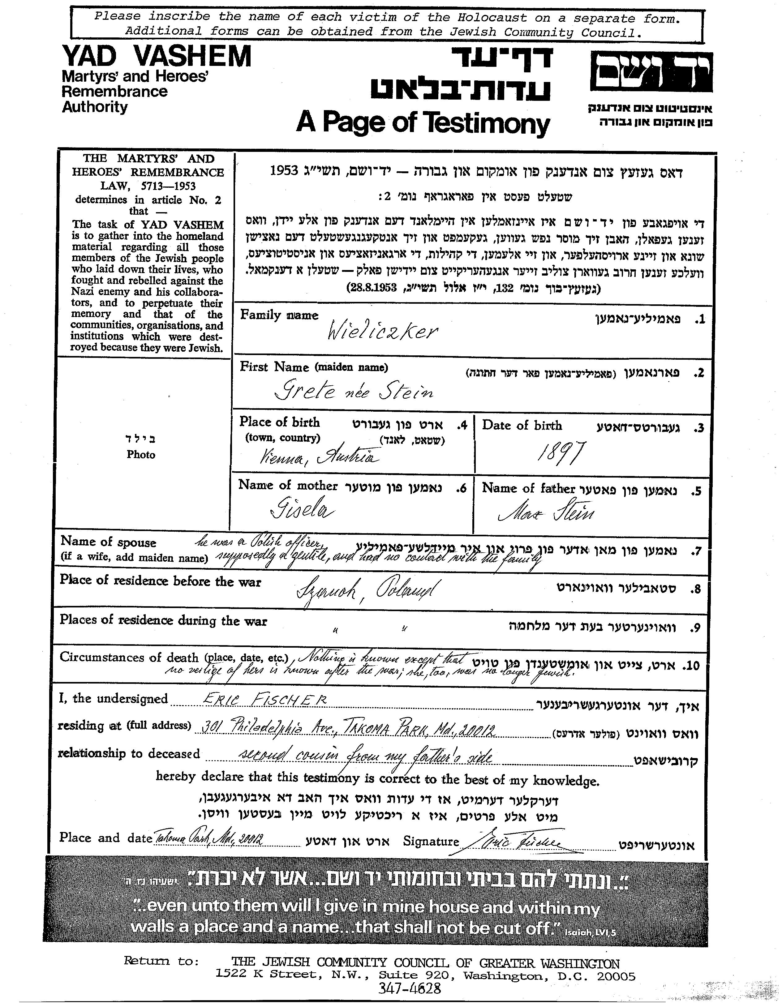 Grete Wieliczker née Stein est née à Vienna, Autriche en 1897, fille de Max et de Gisela. Avant la seconde guerre mondiale elle vivait à Szanow, Pologne. Pendant la guerre, elle était à Szanow, Pologne.